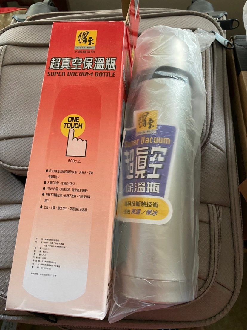This is a stainless steel vacuum bottle in its original packaging. It is 500 ml in capacity and has a one-touch lid for easy pouring. The bottle is ideal for keeping drinks hot or cold for extended periods.