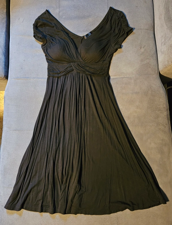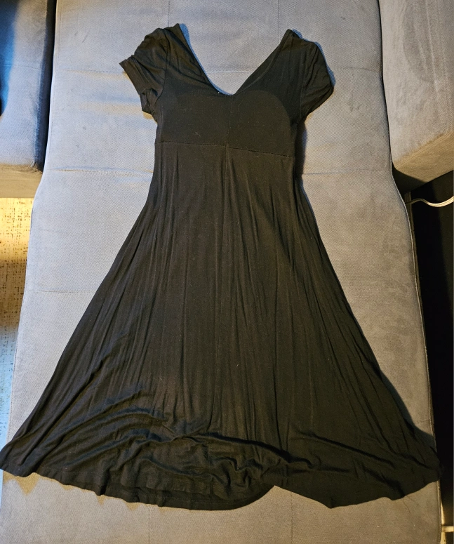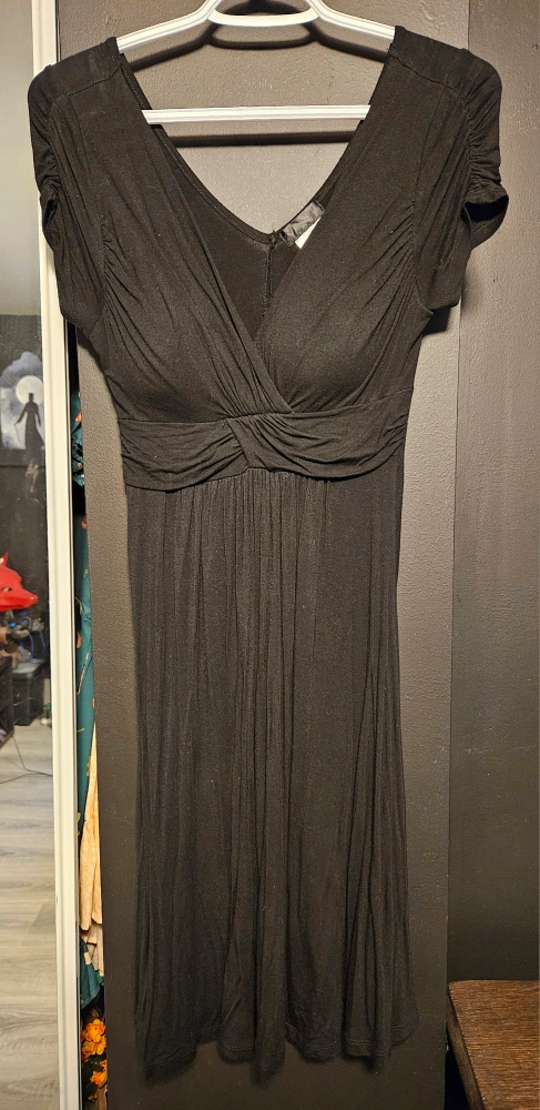 Black V-Neck dress with short sleeves. The dress has a cinched waist and a flowy skirt.