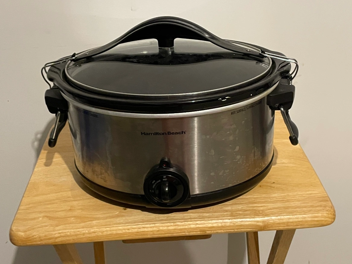 6 qt Slow cooker with glass lid and stainless steel exterior. Comes with two side handles. Features a temperature control knob with low, high, and warm settings. Used 1-2 times