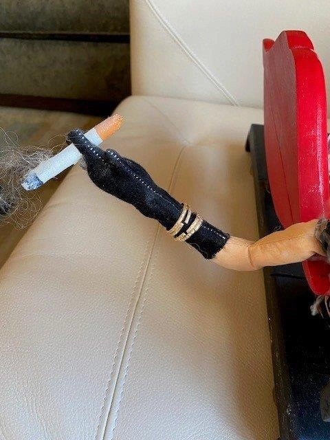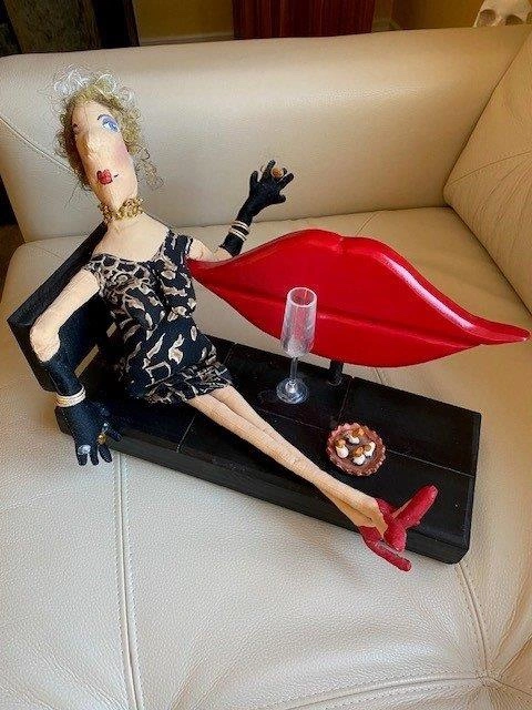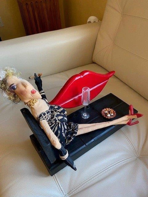 A unique handmade doll in a lounging position. It is one of a kind ‘art’ piece. A lady of a certain age lounging on a red lip wooden bench while enjoying a few cigarettes as evidenced by the ashtray beside her. She is wearing jewelry and drinking a glass of bubbly. The cigarette even has a plume of smoke and her hair is very realistic too! The lady is made of soft stuffed material and her kegs can be moved in different positions. The dimensions in inches are 5 1/2 wide, 14 in length and 10 1/2 inches in height.