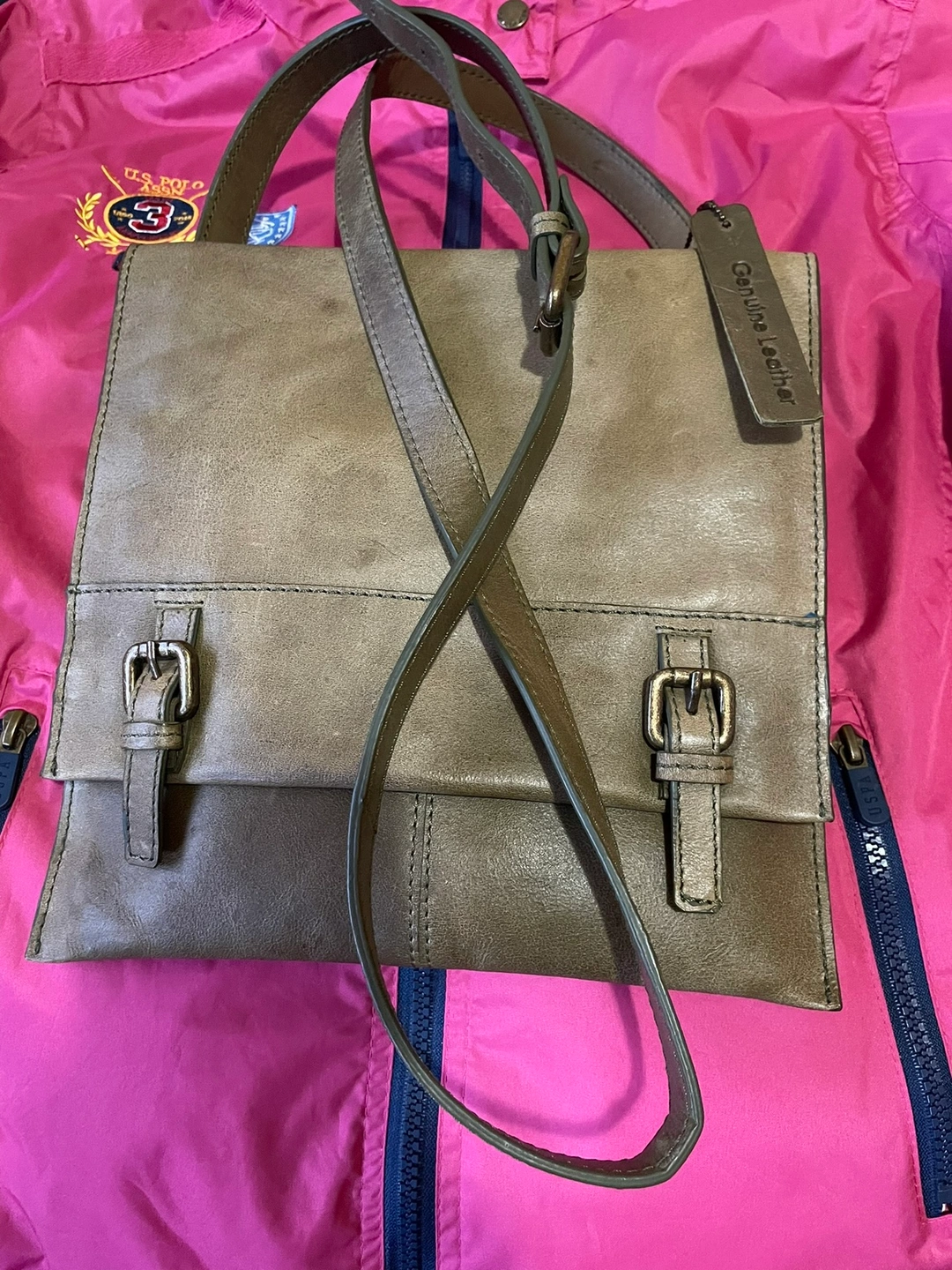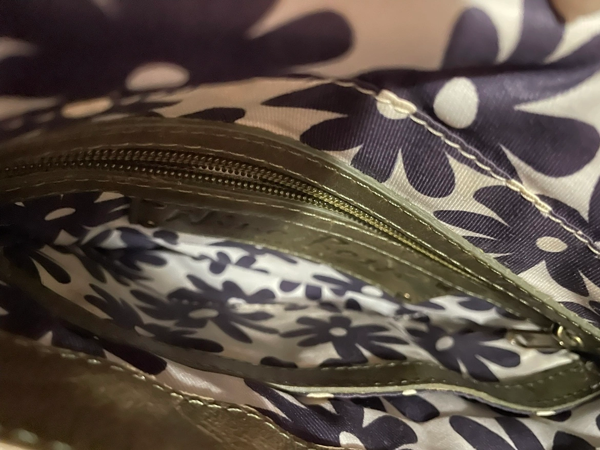 Small olive green leather crossbody bag with a floral interior. The bag has a long strap that can be adjusted. There are two pockets on the outside of the bag, also interior pockets The bag is new in great condition and is ready for its next owner.