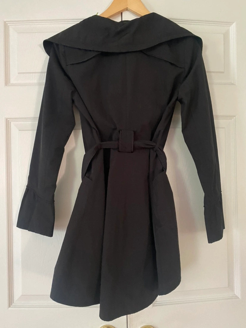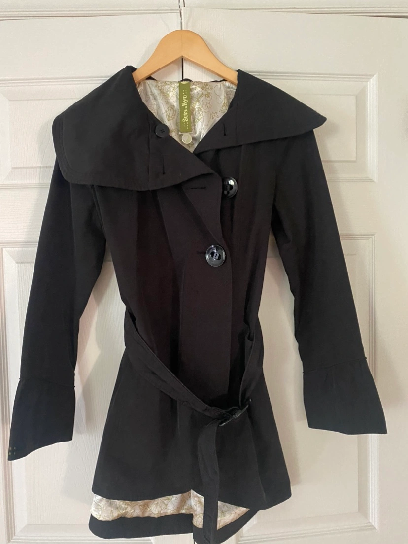 A black belted trench coat with a wide collar and long sleeves. It has a button closure and a belt to cinch in the waist. The coat is lined with a floral pattern.