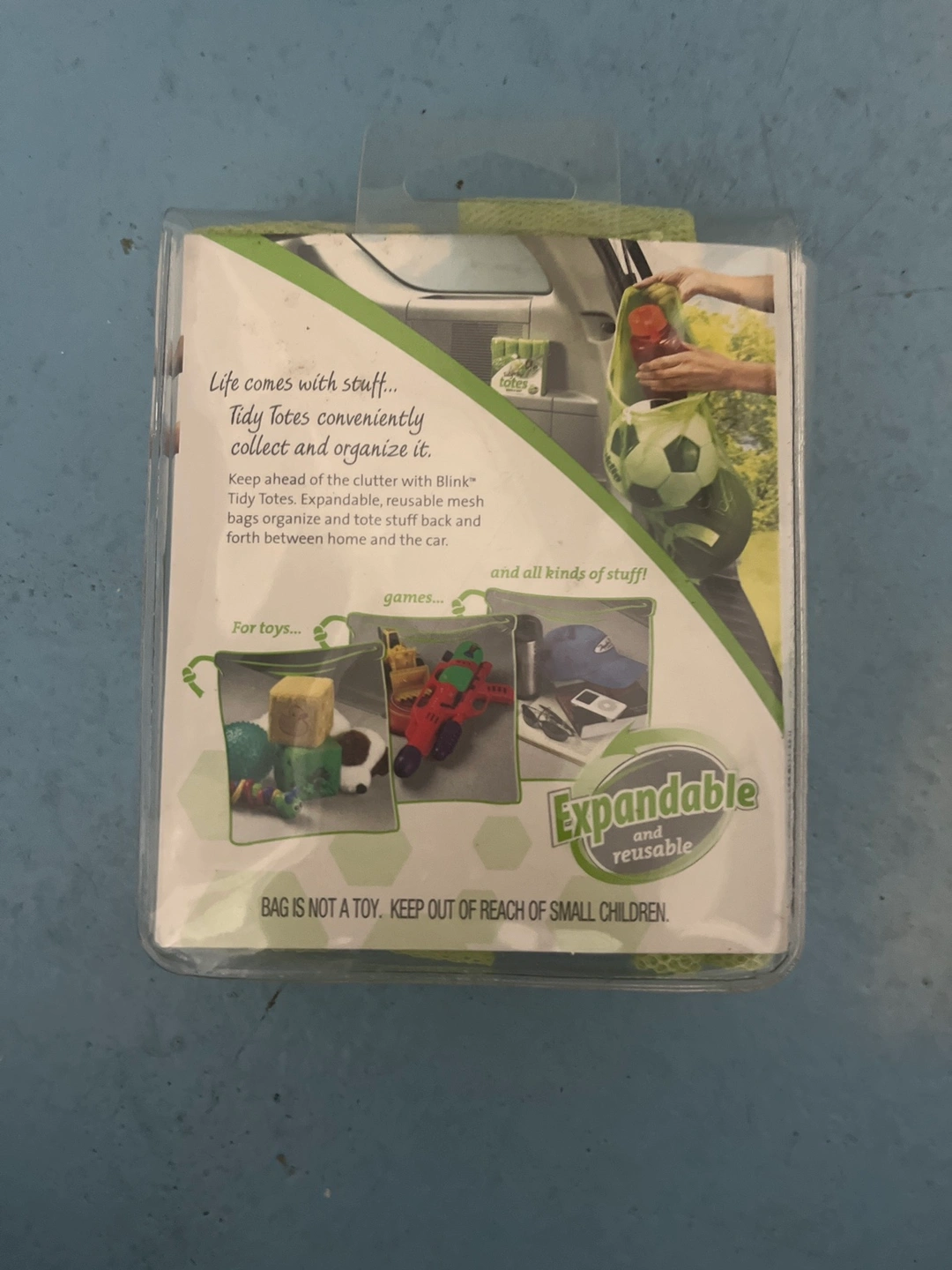 Set of four mesh bags for quick and easy clutter collecting. The bags are expandable and reusable. Great for car storage or to use around the house.