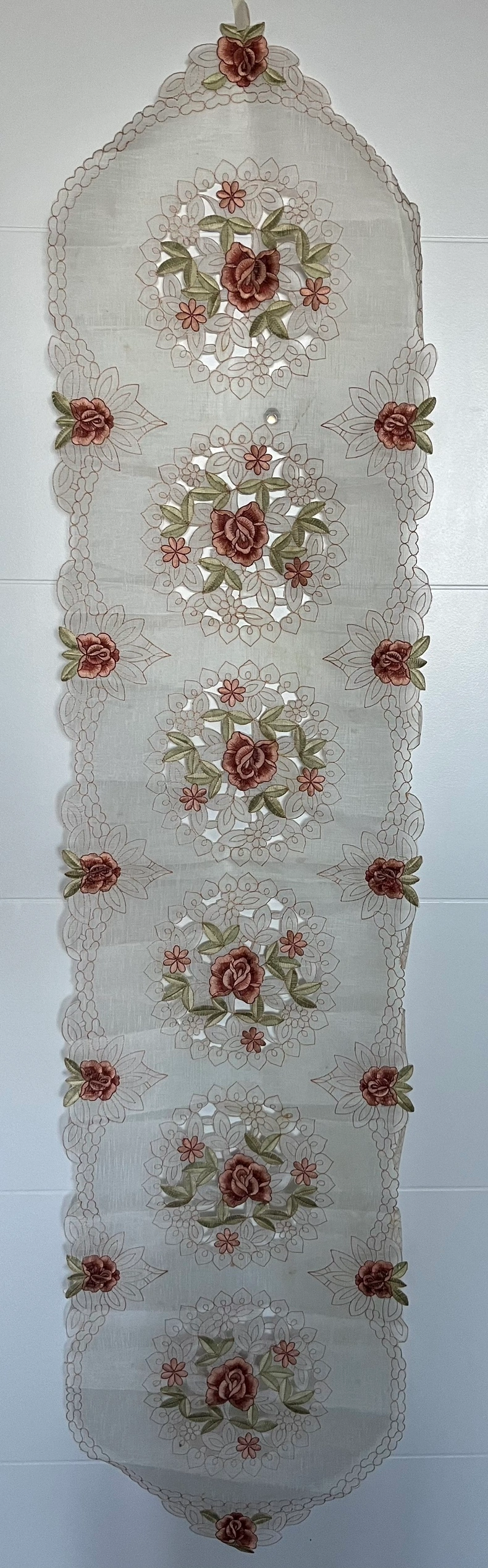 Embroidered table runner with intricate detailing featuring roses and foliage. The runner is cream coloured with beige accents. It features a scalloped edge. It is approximately 68 inches long. Perfect for adding a touch of elegance to your table.