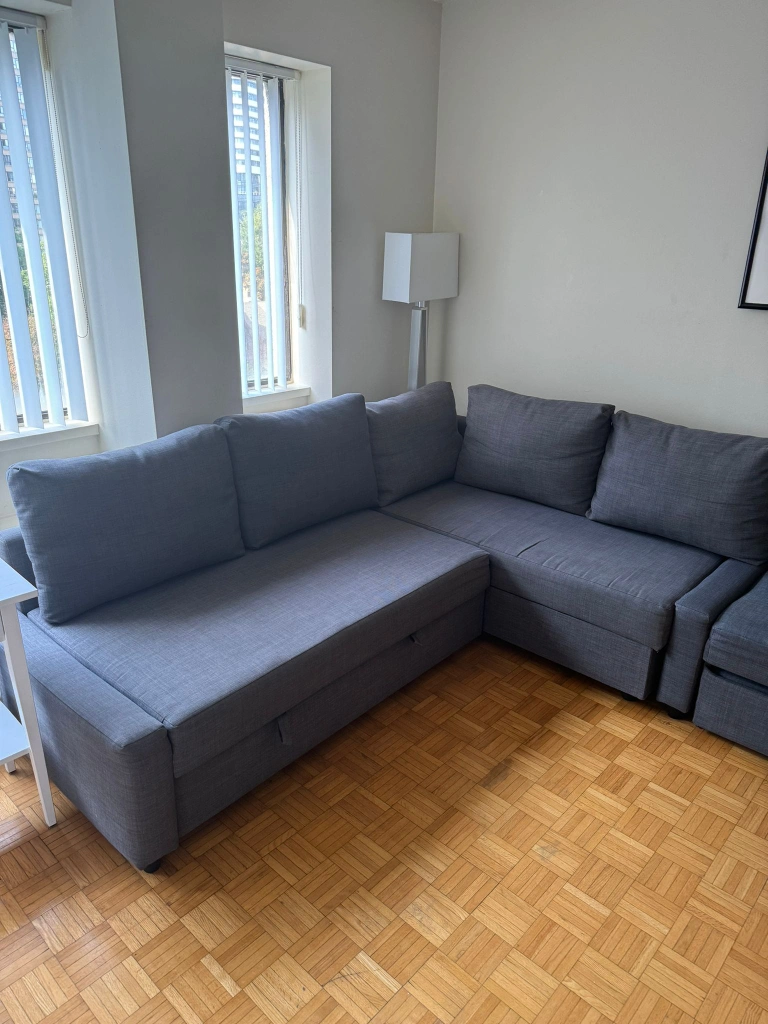 This sofa has a pull-out bed feature and is great for small spaces. It also comes with extra cushions that can be used to make the seating area larger. delivery in GTA 50$ extra.