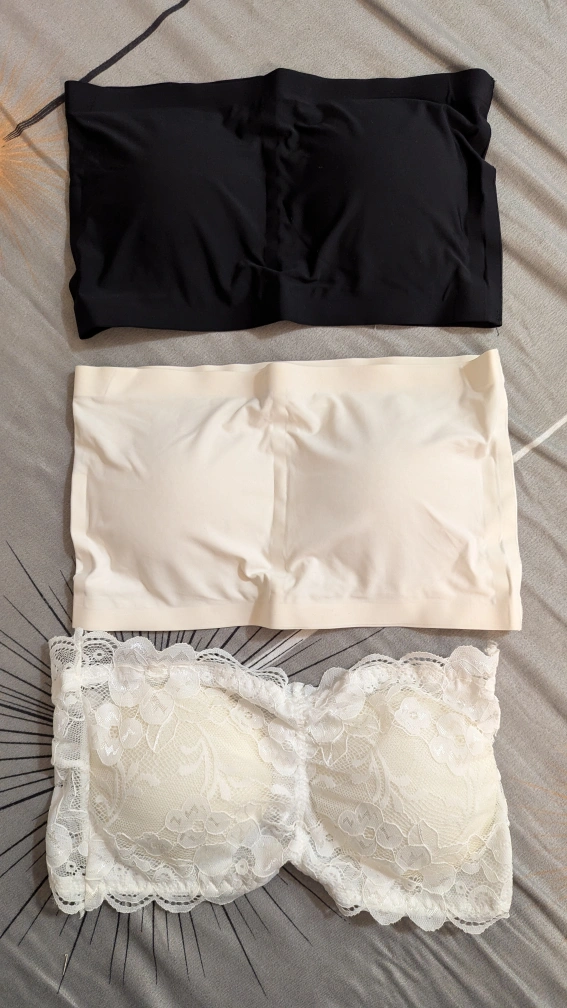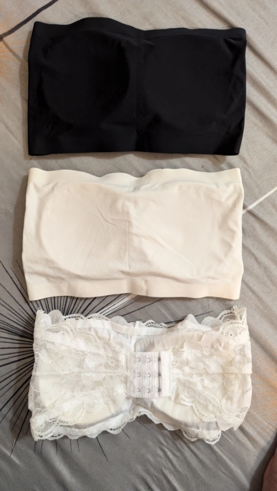A pack of three strapless bras, one black, one nude, and one white lace.