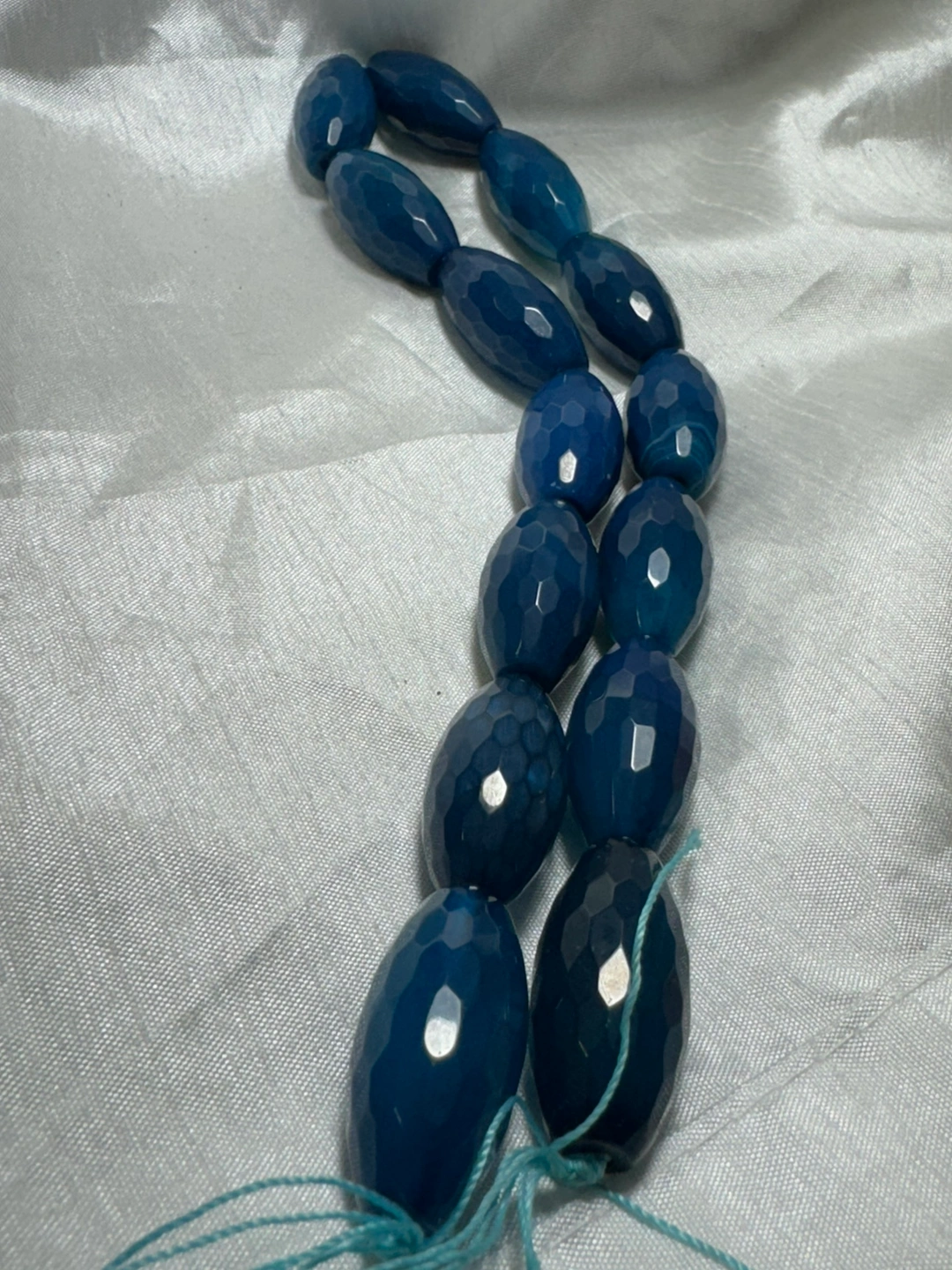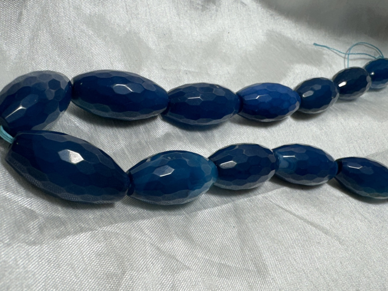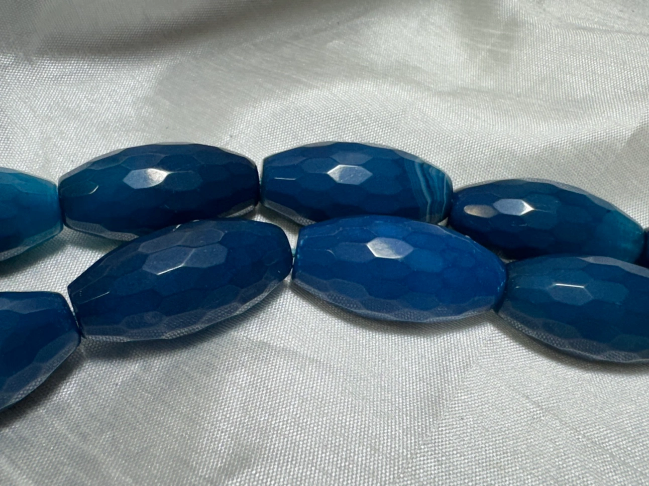 This is a strand of blue agate beads, with a faceted, oval shape. There are approximately 184 beads on the strand, bead size : 28mm x 13 mm
