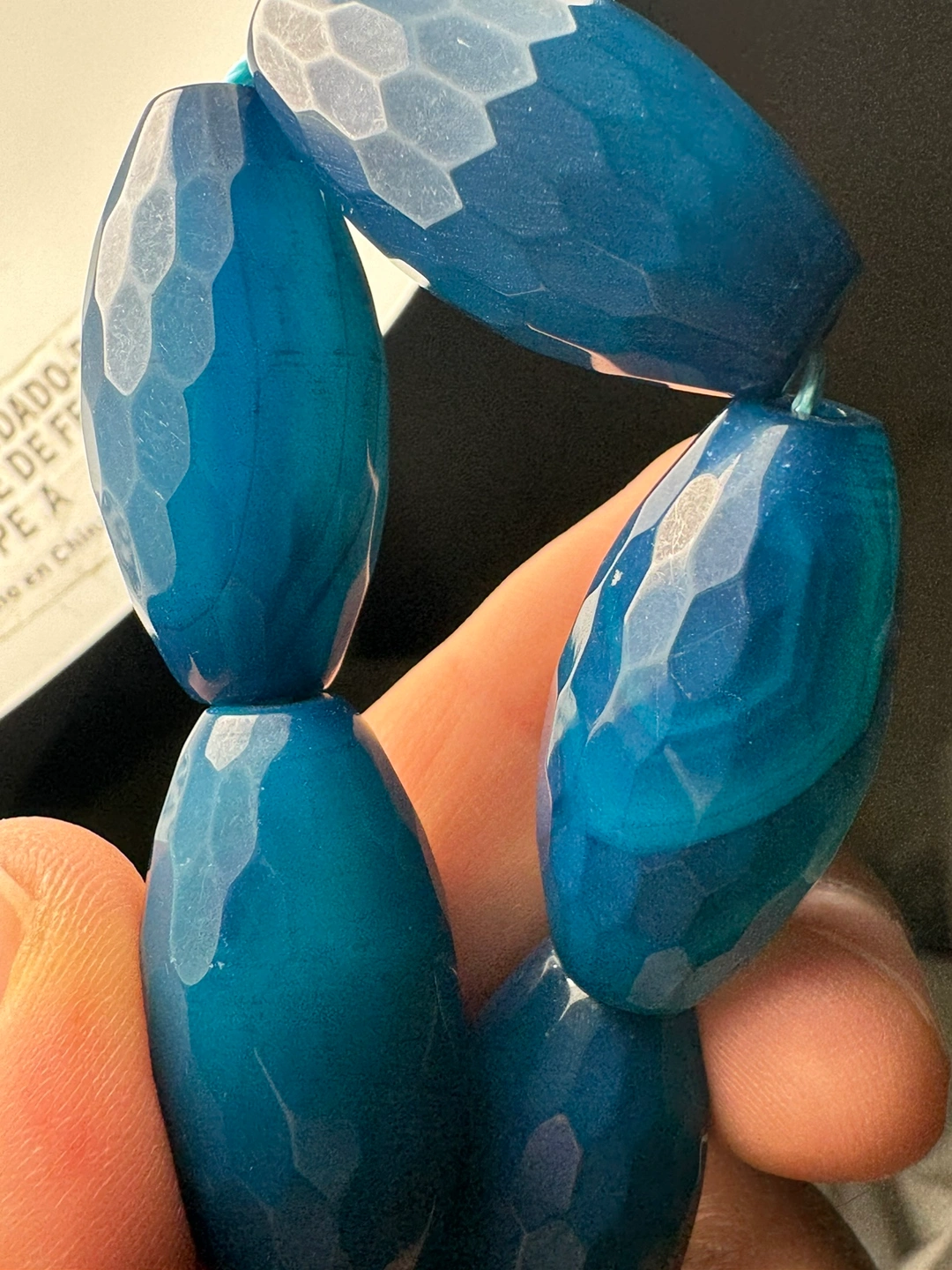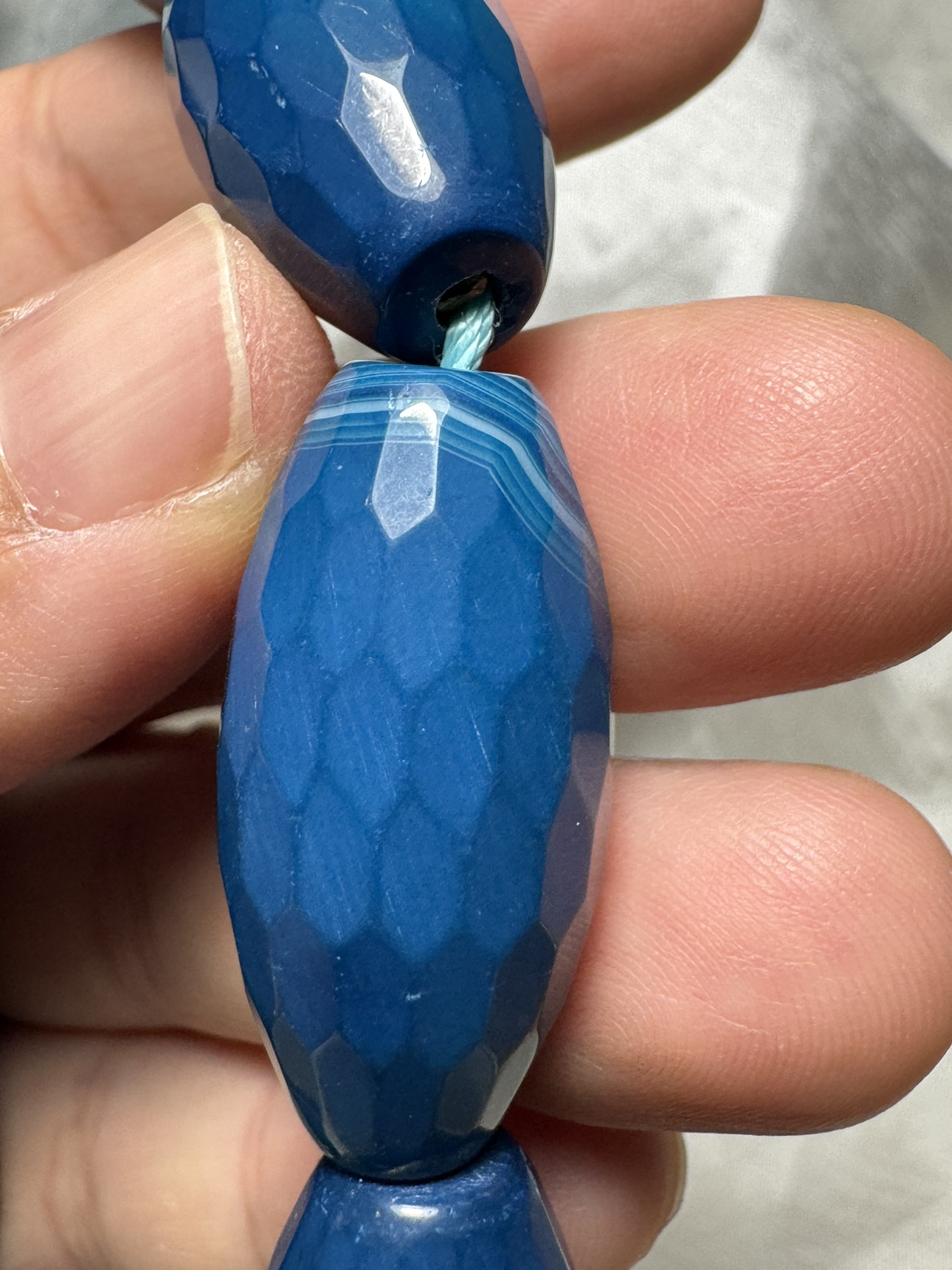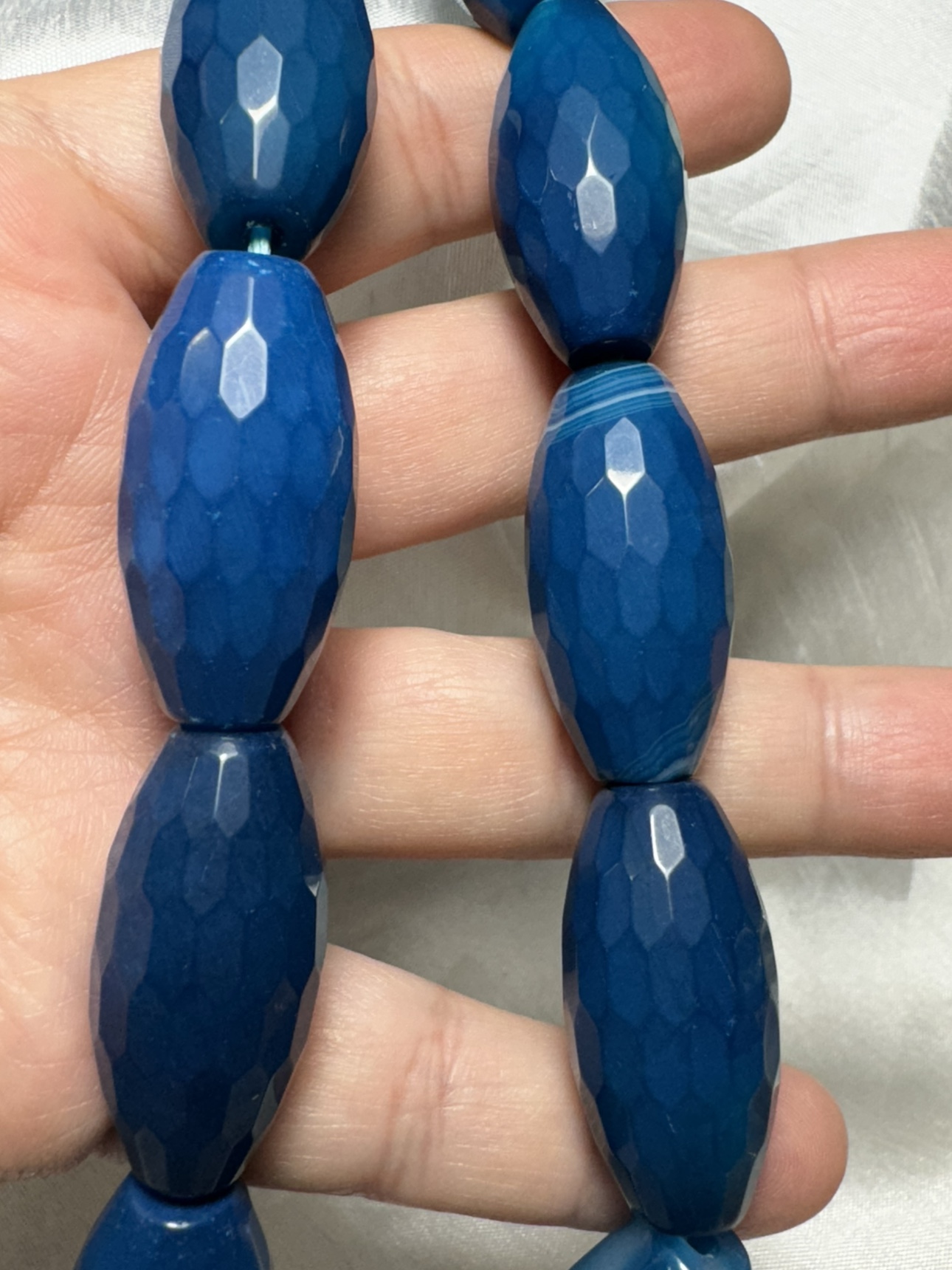 This is a strand of blue agate beads, with a faceted, oval shape. There are approximately 184 beads on the strand, bead size : 28mm x 13 mm