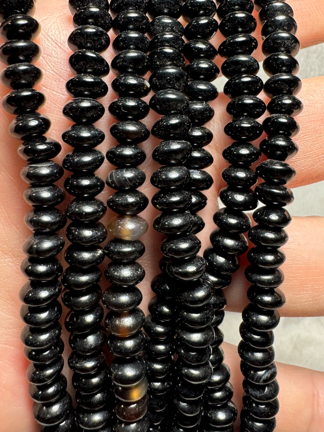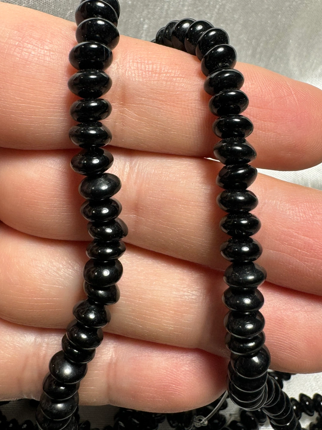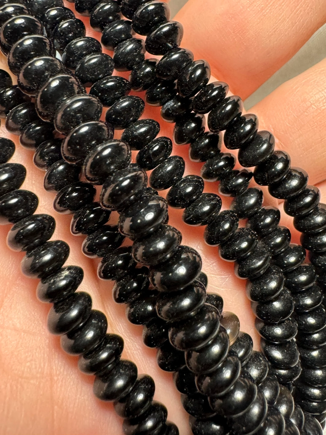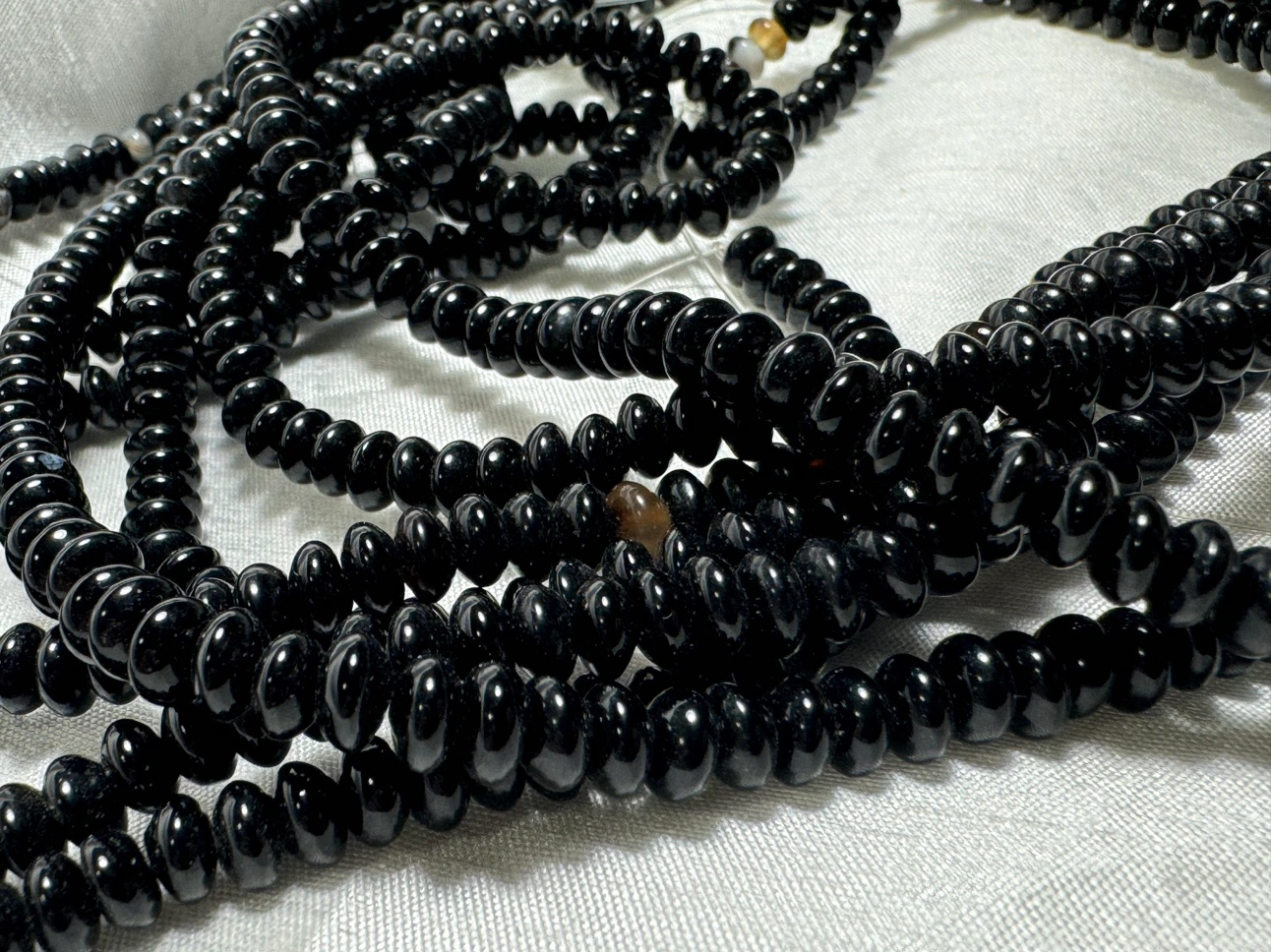 A strand of black onyx beads. These beads are perfect for jewelry making or crafting. There are approximately 119 beads on the strand. The beads are all uniform in size.