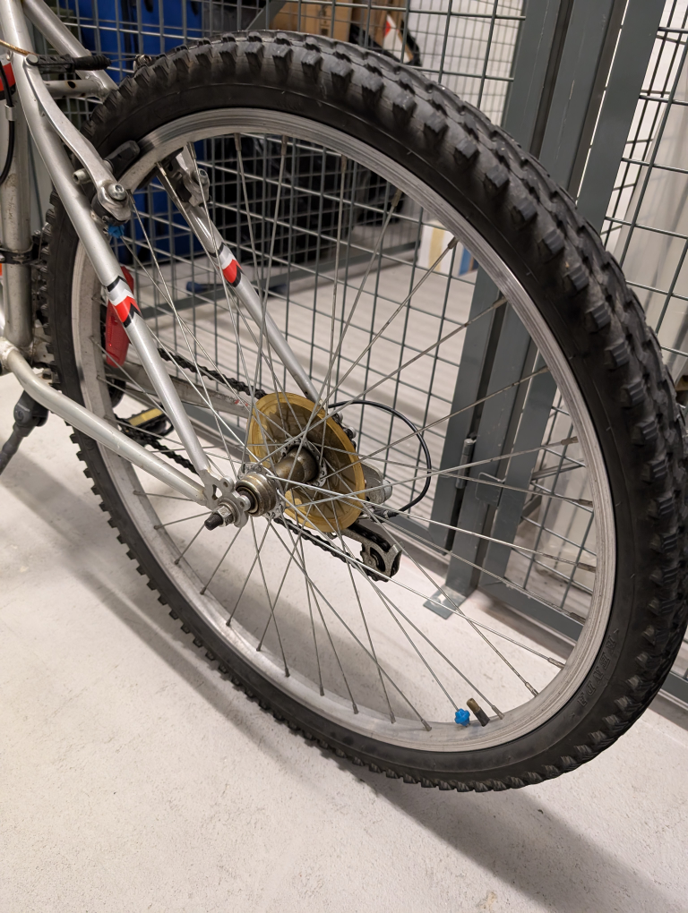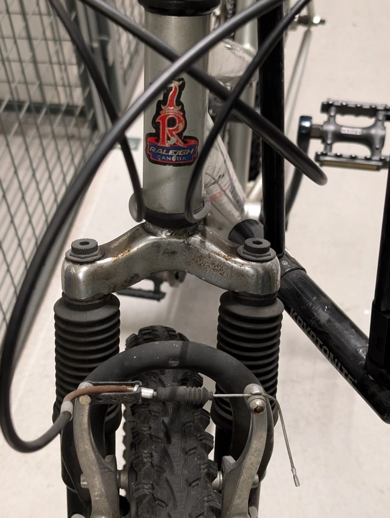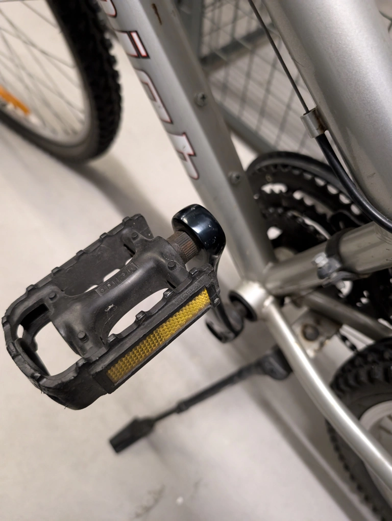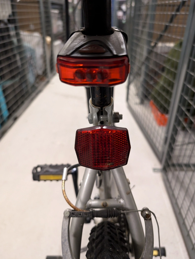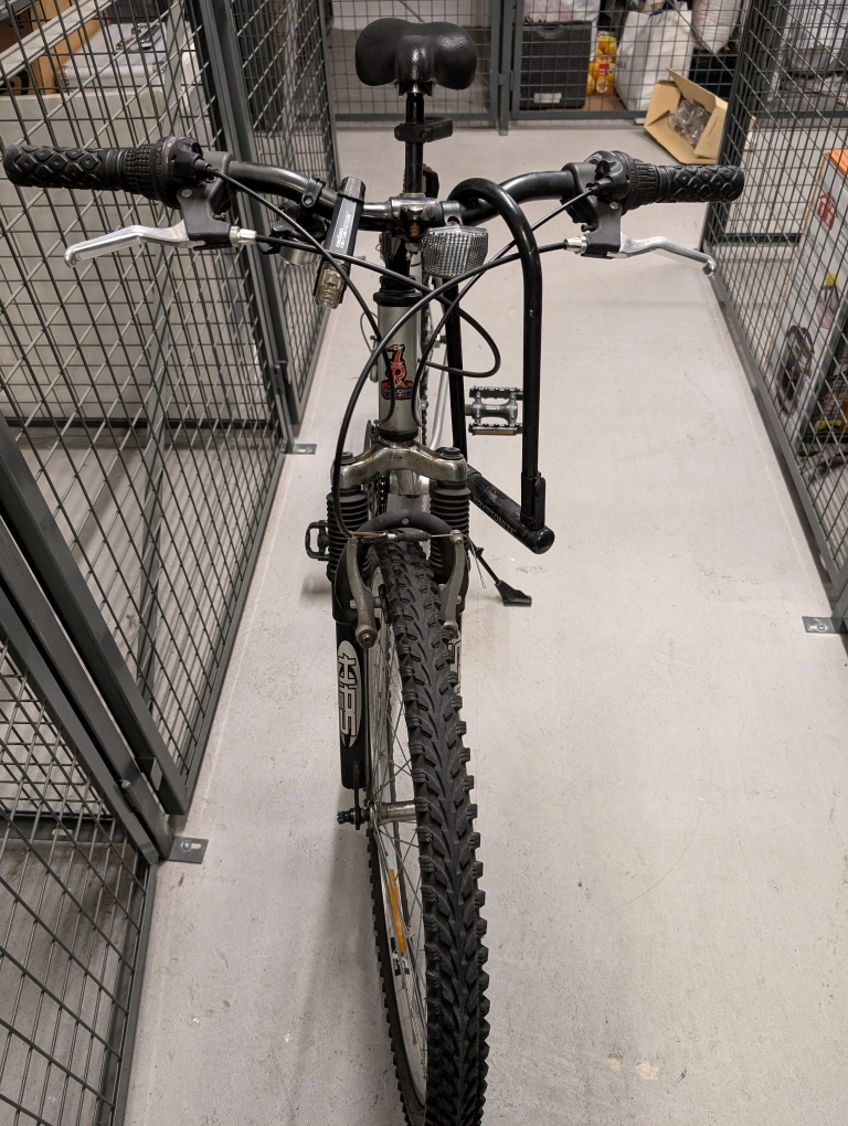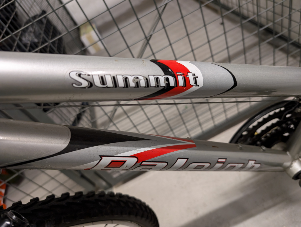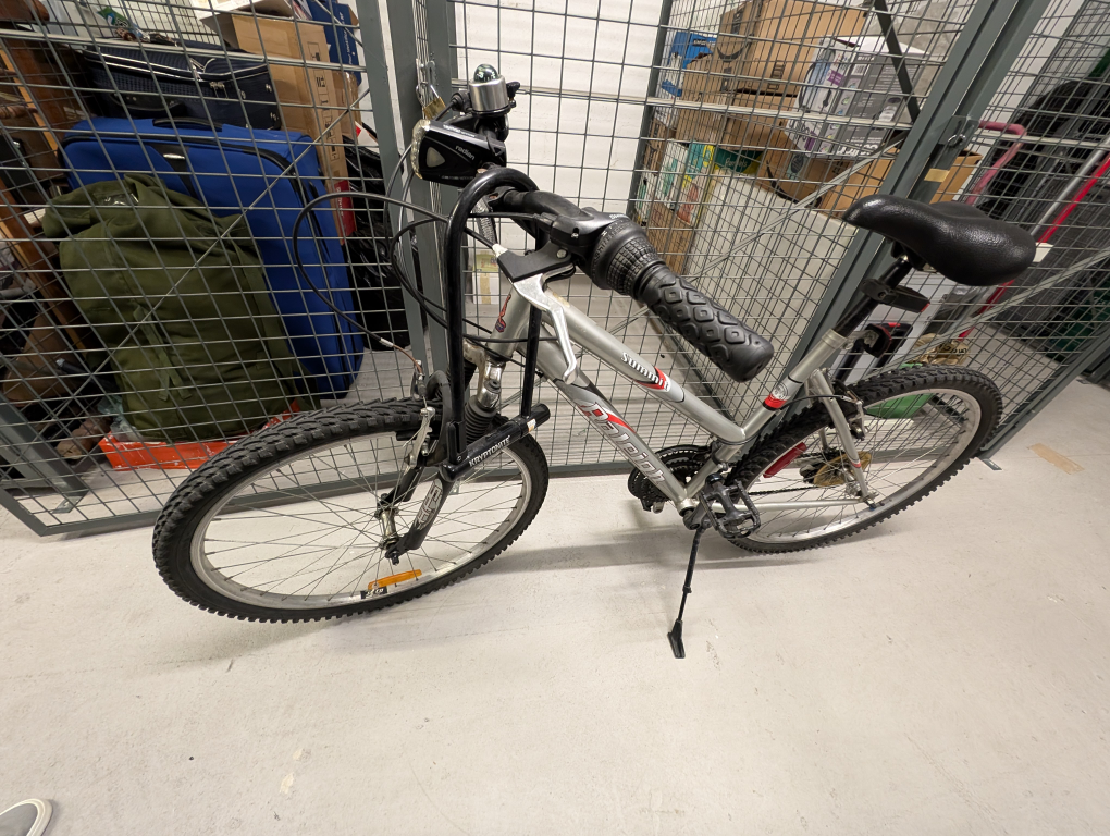 Medium sized Summit Raleigh silver mountain bike. In good condition, fully functioning. Comes with bell with compass feature and two lights. Kick stand included. Saddle can be adjusted, ridden by a 5ft6 person and a 6ft1 person. Moving abroad so unfortunately I can't take it with me!