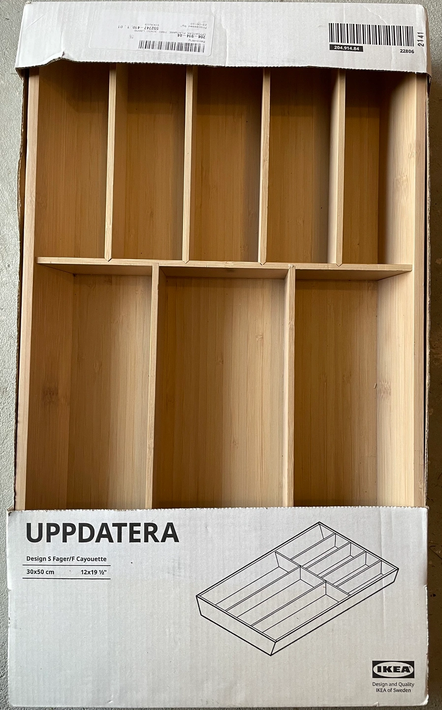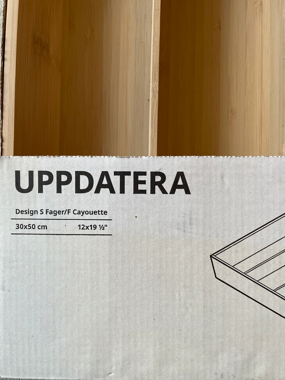 Bamboo drawer organizer with 6 compartments. It is 30x50 cm or 12x19 inches. It is in the Design S Fager/F Cayouette style.