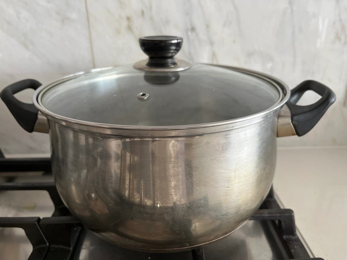 This is a stainless steel pot with a glass lid. It has two black handles. The pot is in good condition and is ready for your next culinary creation.