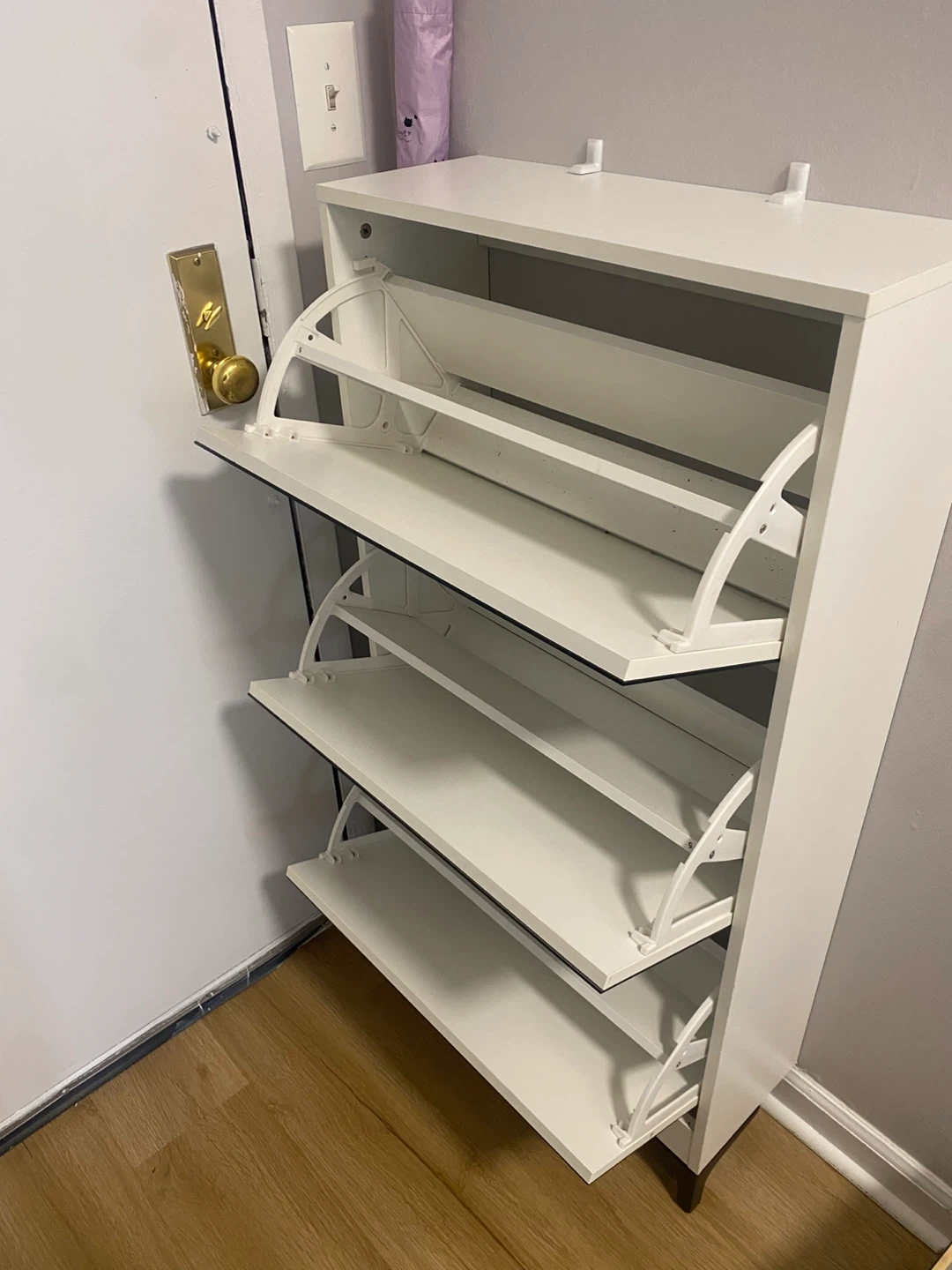 Este zapatero de pared blanco cuenta con espejo y tres estantes inclinables. Es perfecto para organizar el calzado en culquier espacio comodo. Dimensiones del gabinete: 20” de ancho x 9,5” de profundidad x 32” de alto.