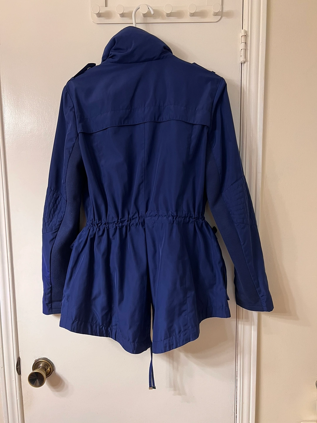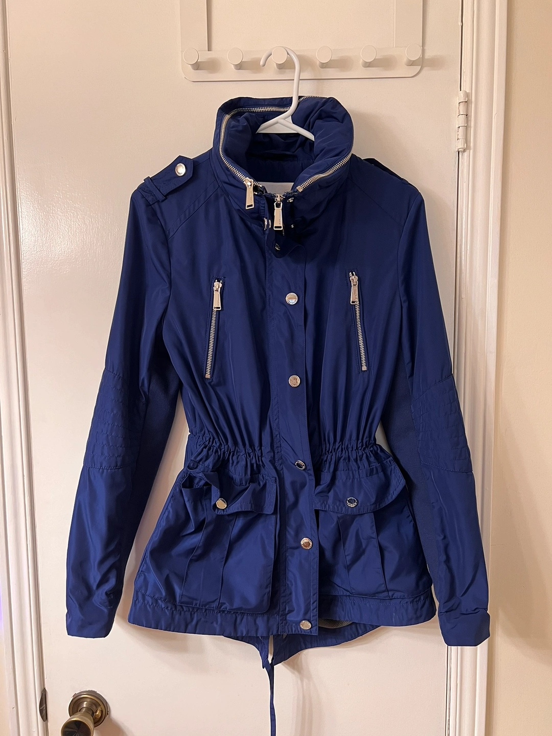 This jacket has a high collar, two zippered pockets, a hood and a drawstring waist.