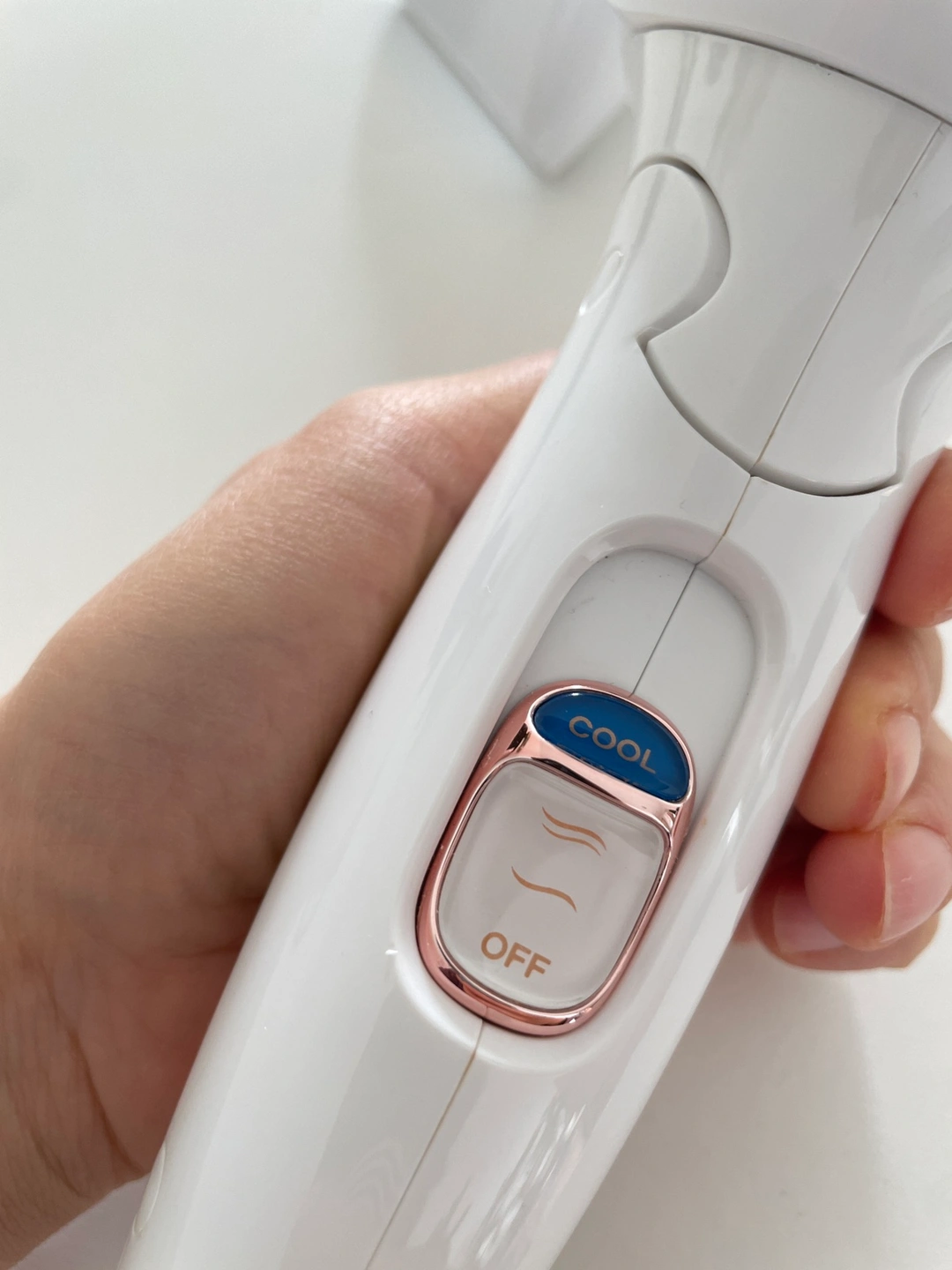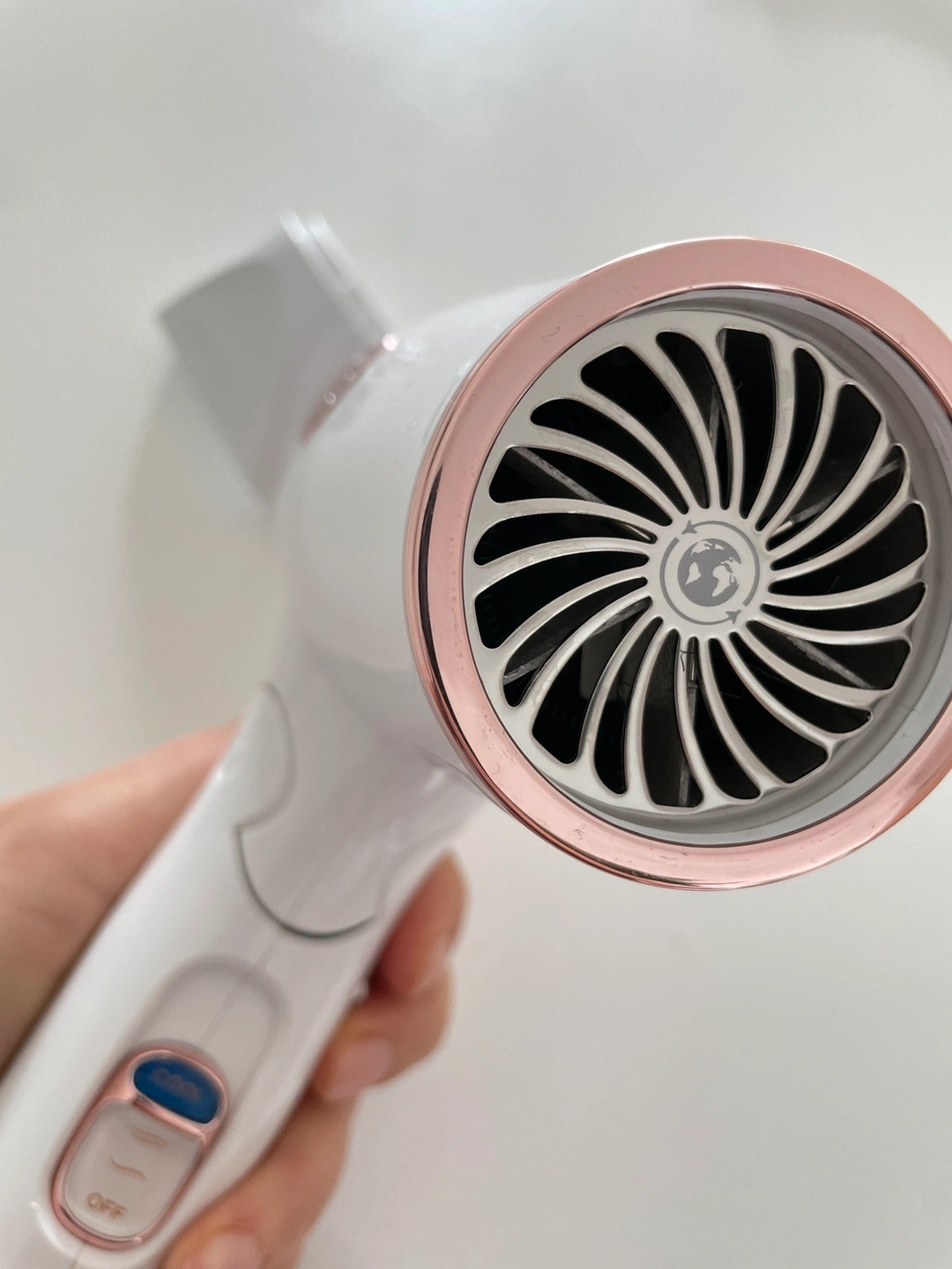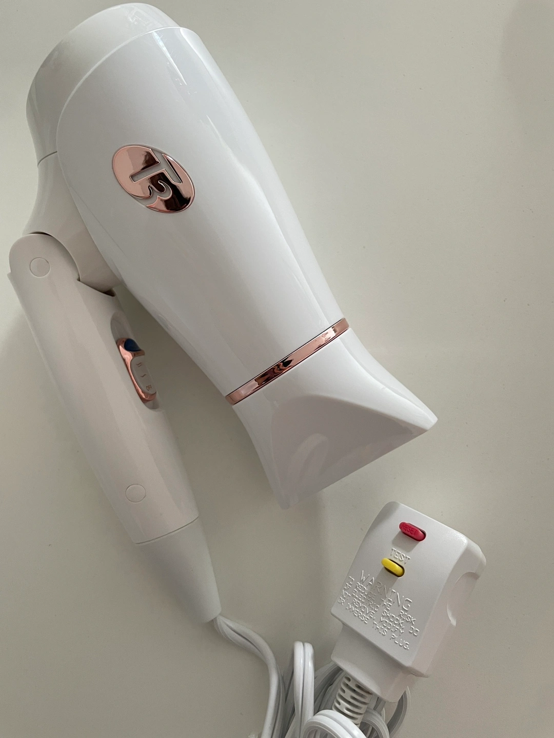 T3 white hair dryer with rose gold accents. It has two heat settings and a cool setting. It comes with a plug and a cord.