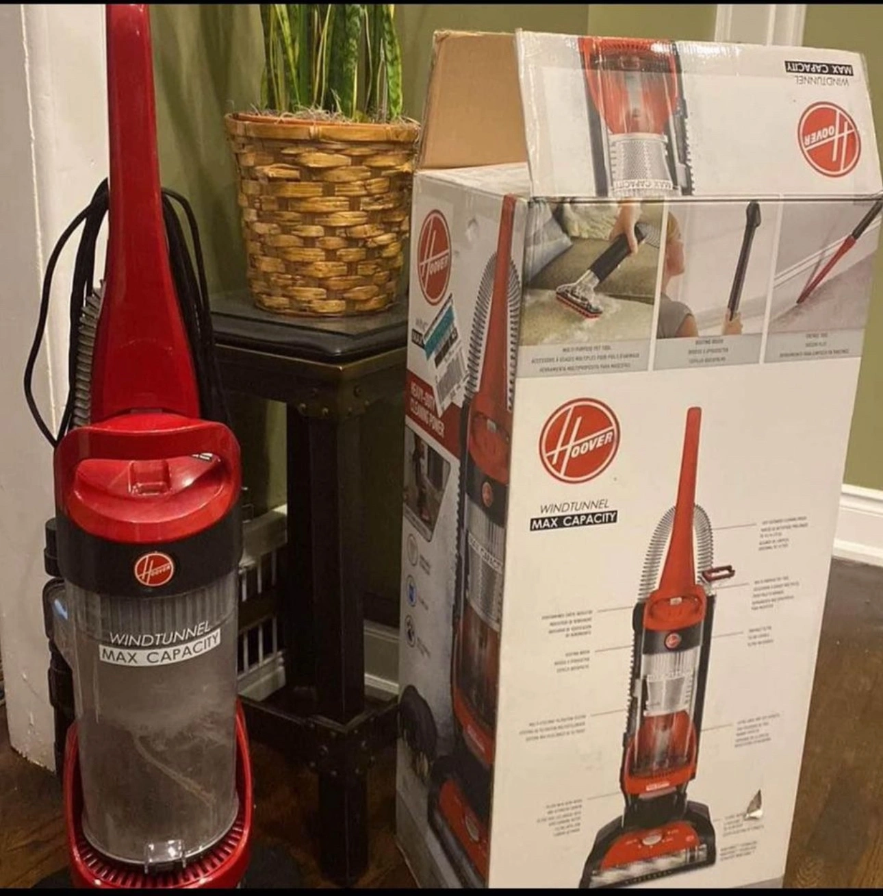 A red Hoover Windtunnel Max Capacity upright vacuum cleaner with a bagless dust cup. It comes with the original box and accessories.