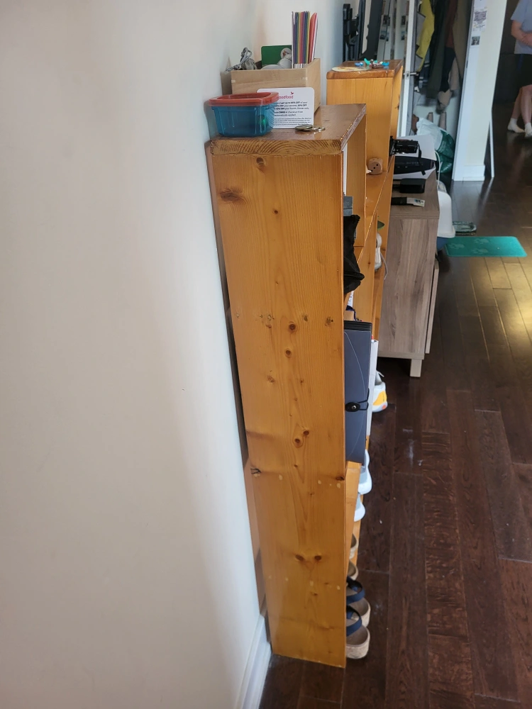 A wooden bookshelf with open shelving. bought second hand a couple months ago. getting rid of it as we are moving.
