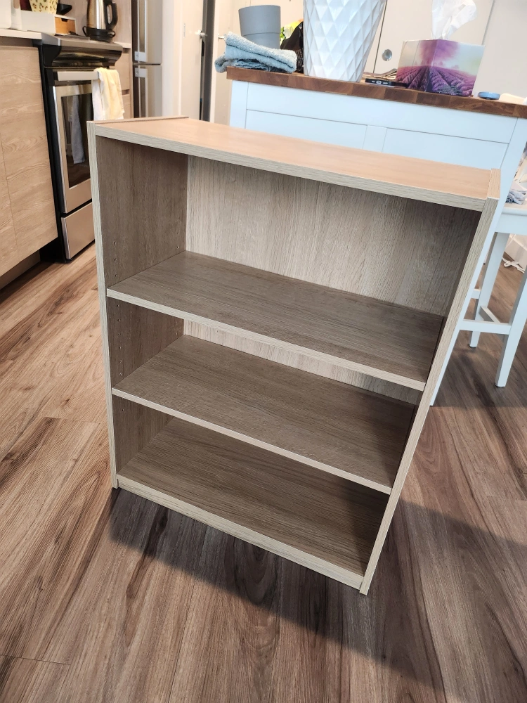 This bookcase is perfect for storing books, decorative items, or anything you need to keep organized. It features three shelves and a simple design. The side jas slightly faded in color due to sunlight.