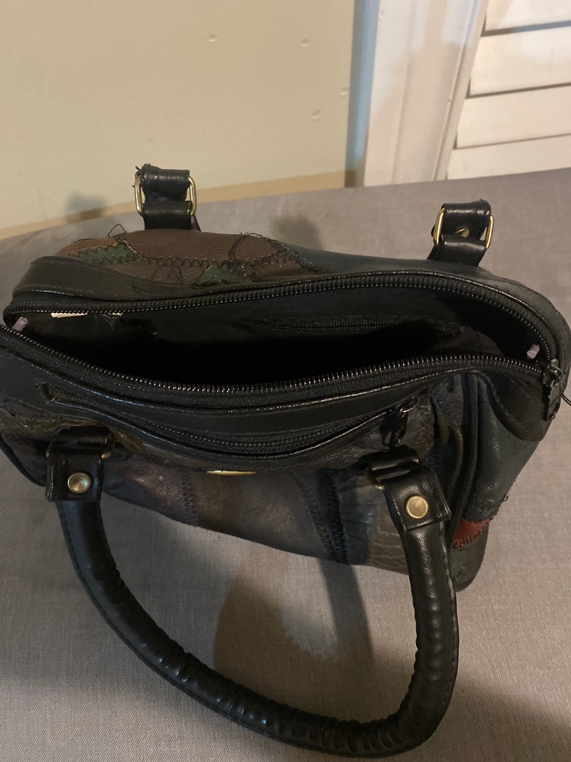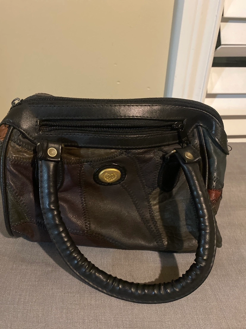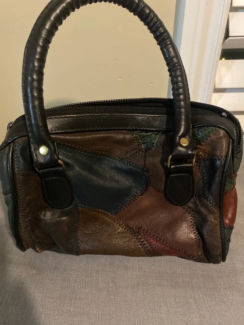 A small patchwork leather handbag with a zipper closure. It has a single top handle.
