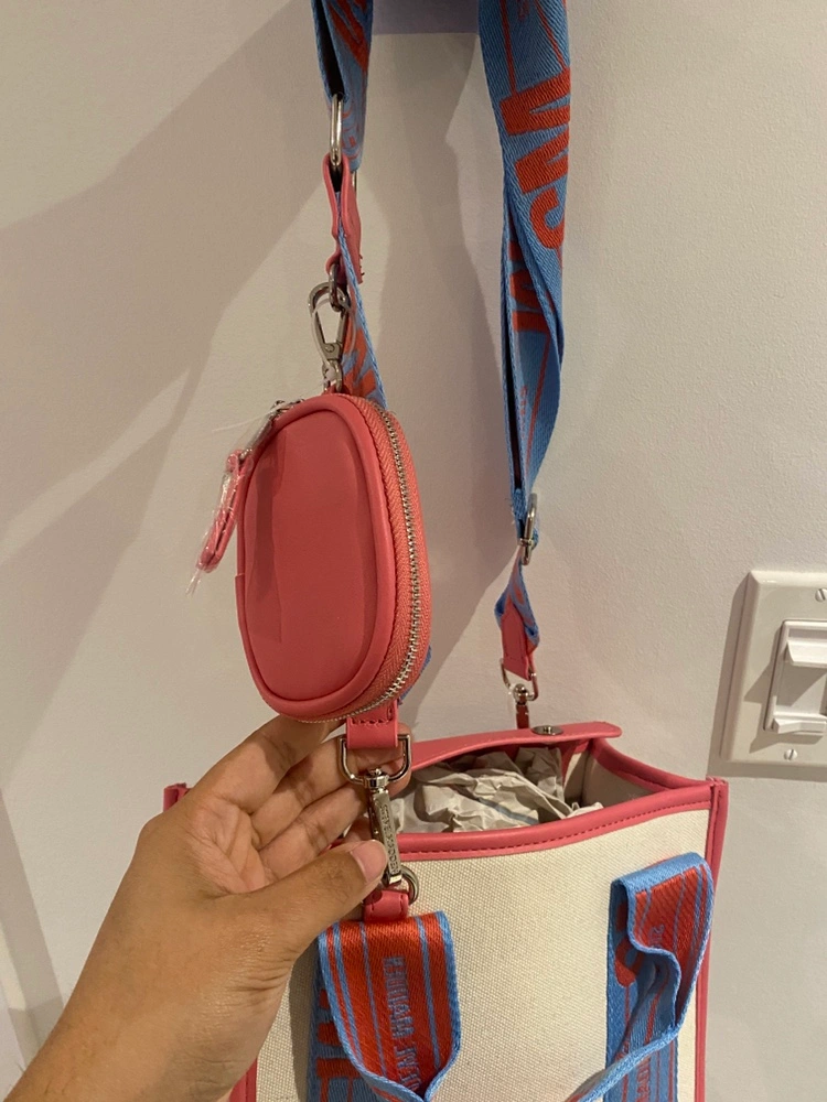 This tote bag has a detachable crossbody strap. It includes a small purse that attaches to the bag with a clip. The purse also has a clip so it can be used as a keychain. The bag is made of a canvas material and has a pink, blue, and white colour scheme. I received it as a gift but its just not my style. New with tags. Pick up in North York :)