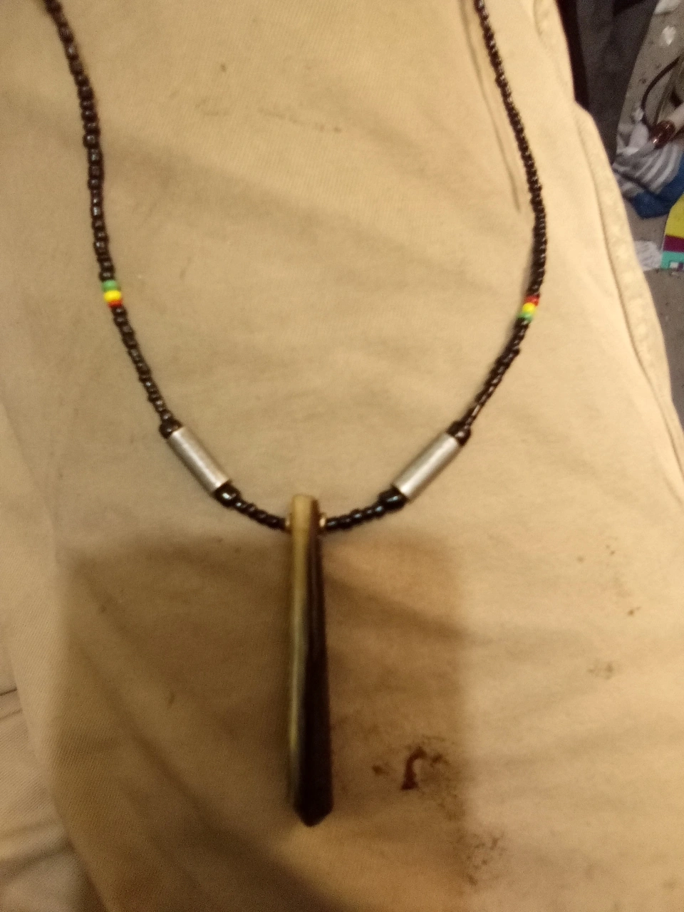 only available for pickup 🙂 Beaded necklace with a long, thin pendant. The necklace is black with a green, yellow, and red accent at the top of the pendant. The pendant is made of what appears to be a light coloured material with black markings. The necklace has a clasp closure.