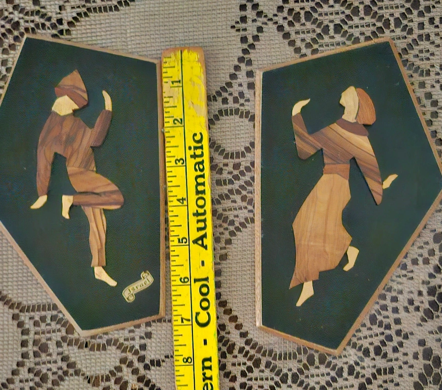 Two woodcuts of dancing figures made in Israel. Each piece is approximately 5.5 inches tall and 4.5 inches wide. They would be a great addition to any home decor.
