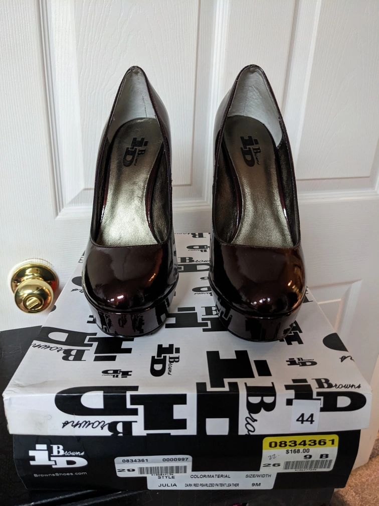These are platform heels with a burgundy patent leather finish. They are size 9.