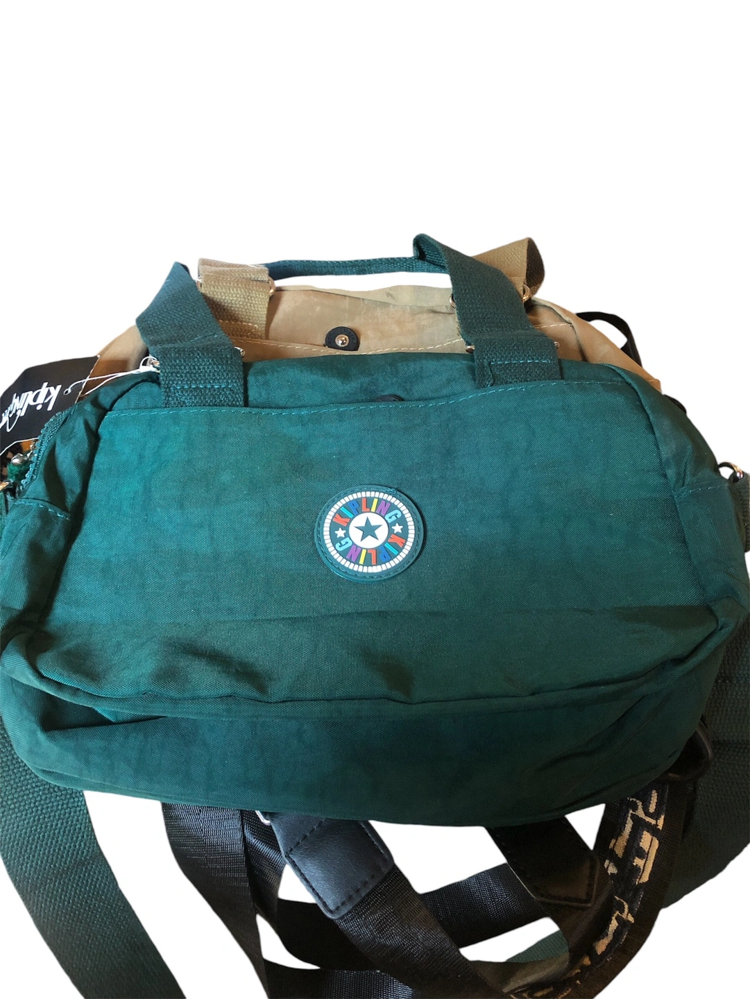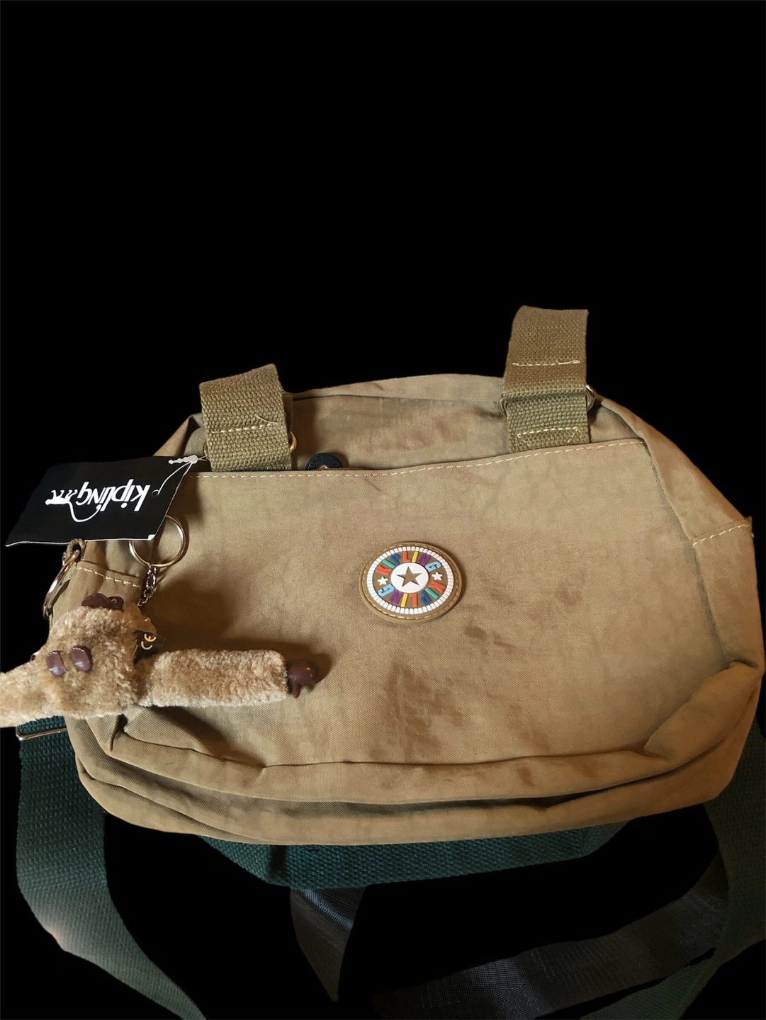 This bag is a small crossbody style, with a long strap that can be adjusted, and a top handle for carrying. Available colors green/ brown with tan trim and features the iconic Kipling monkey keychain.