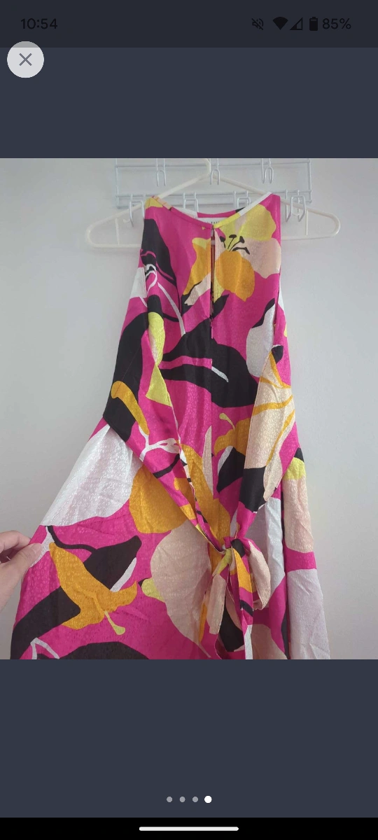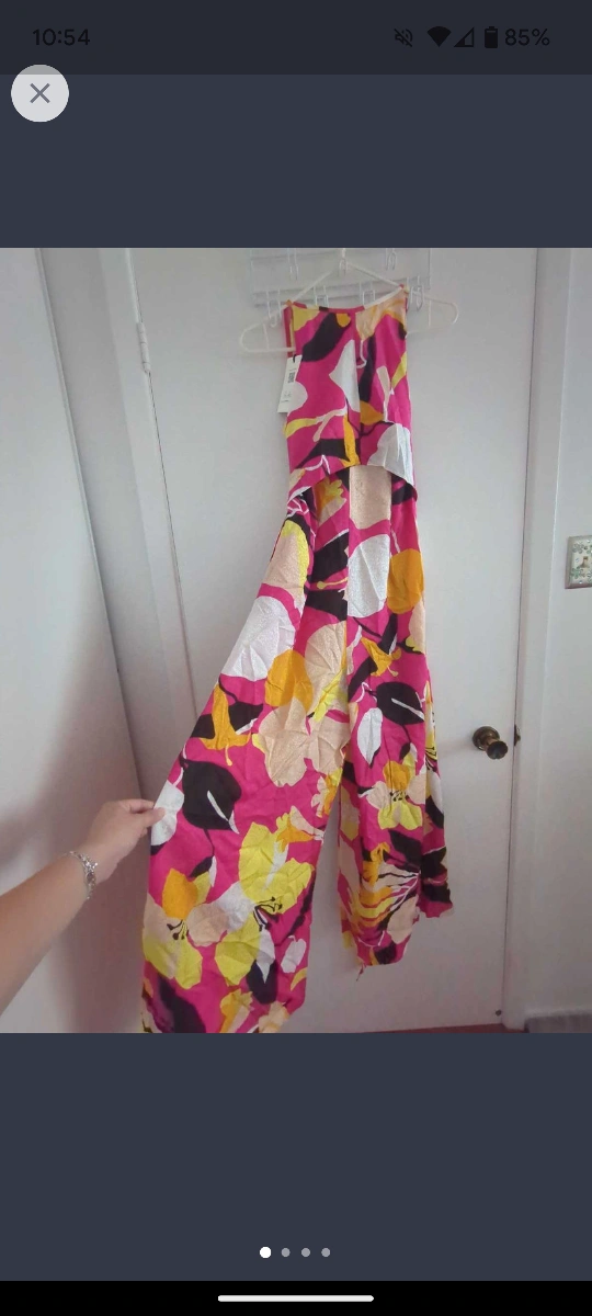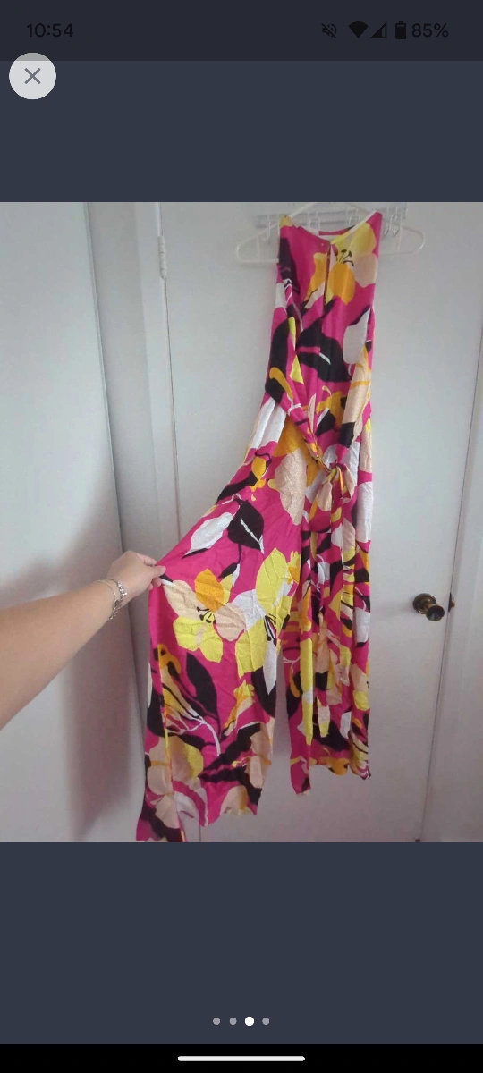 A beautiful floral jumpsuit with a halter neckline and a tie detail at the waist. The jumpsuit is made from a lightweight fabric. Ted baker never worn. Size 1, has a front tie for slimming effect and has pockets! Please contact for easy efficient sale, cash only Union station or 298 John St Thornhill