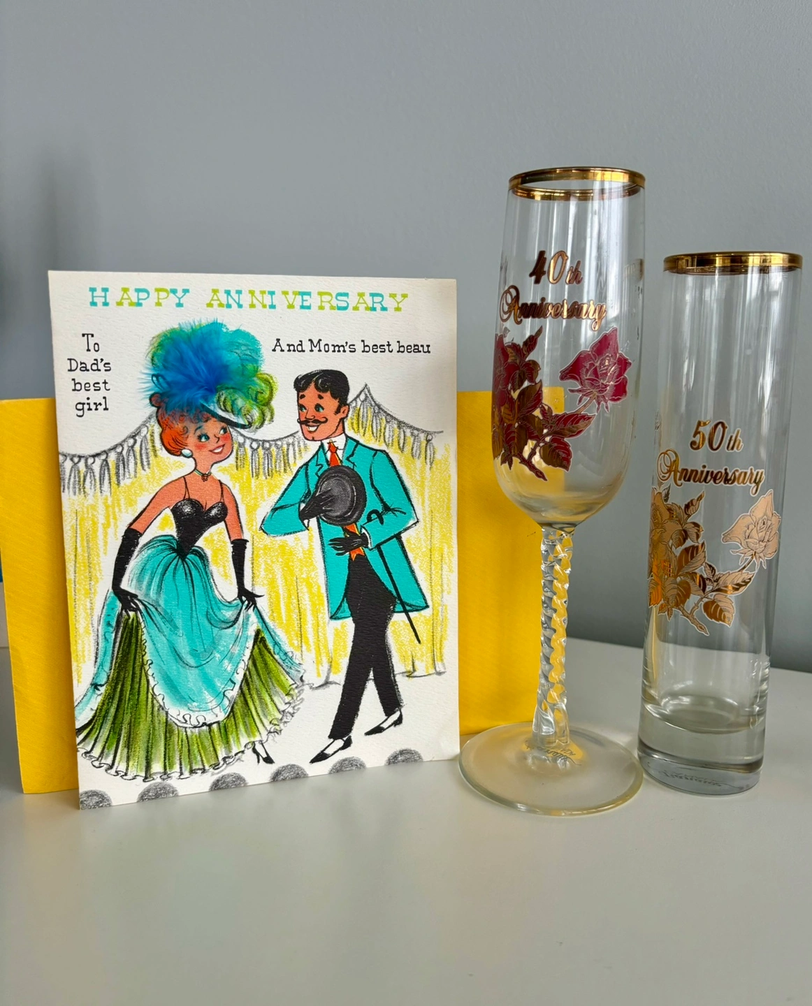 Set of two glasses with gold trim and floral design. One champagne flute and one tall glass. Both glasses have gold lettering indicating "40th Anniversary" and "50th Anniversary“. A vintage Happy Anniversary card is included (see 2nd pic), all for $3 only.