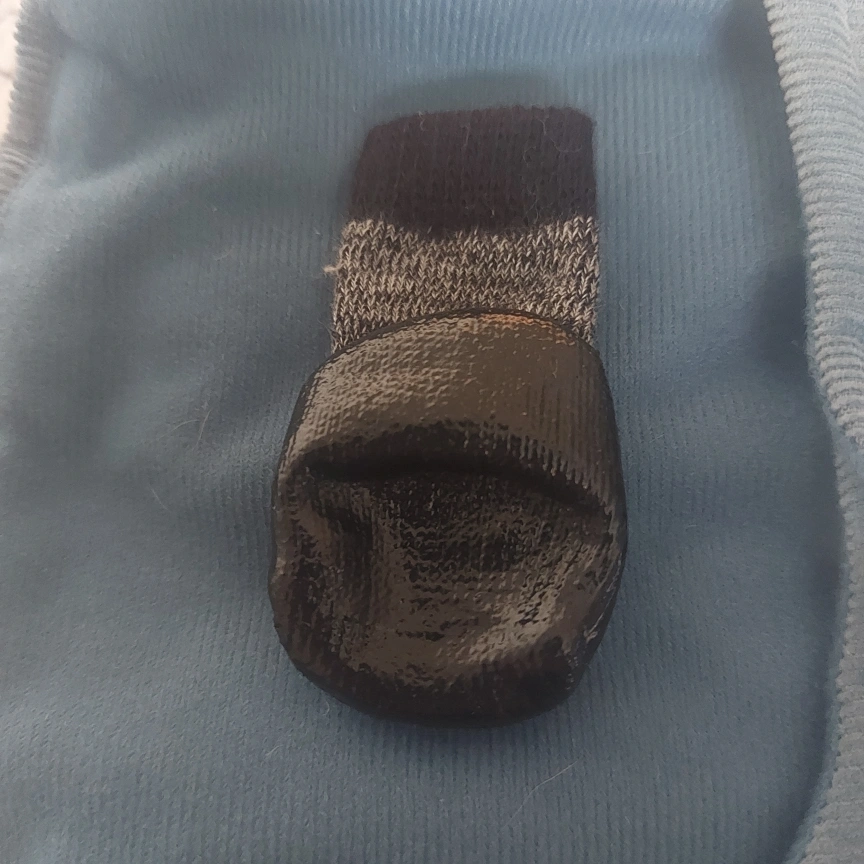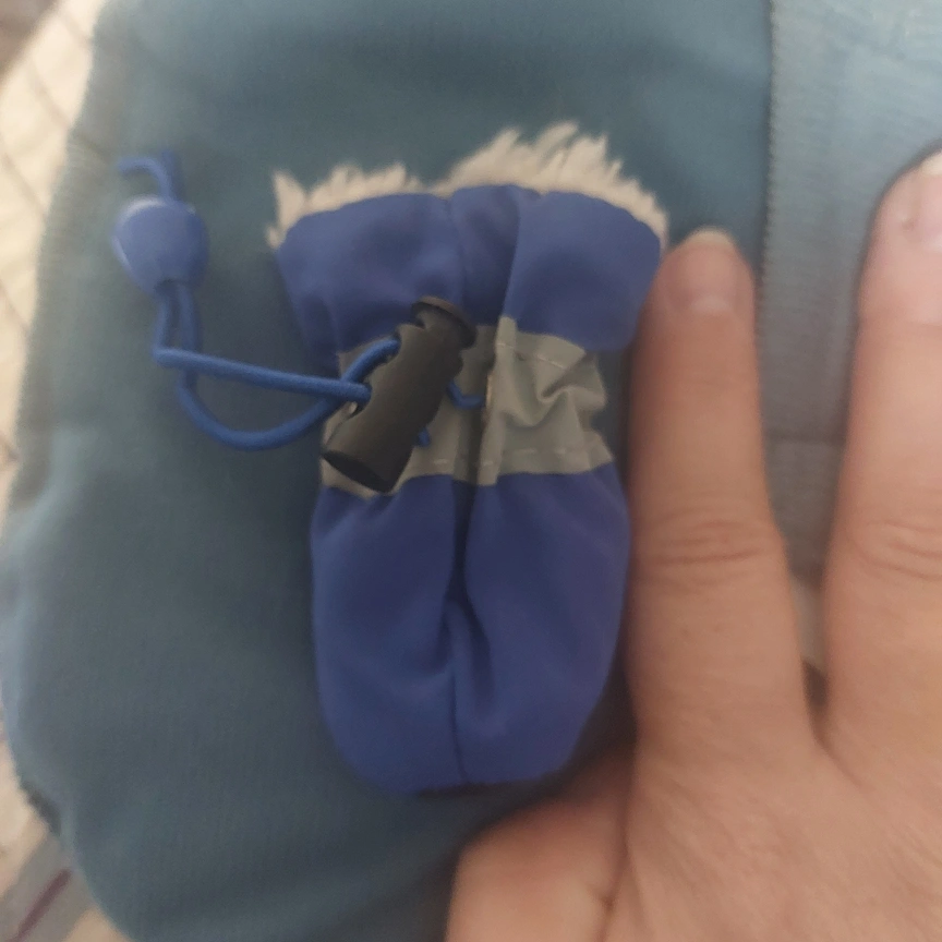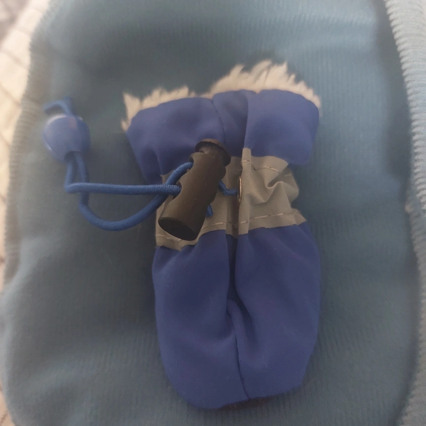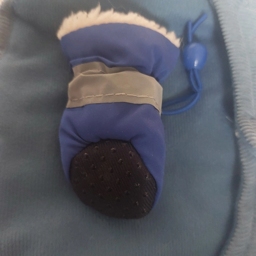 2 sets of 4 tiny dog boots. The Pawks are black slip on socks with a durable bottom. The blue ones are very soft/warm fleece inside, have a toggle strap to secure them to your dog's paws. They have a reflective strip on the side.