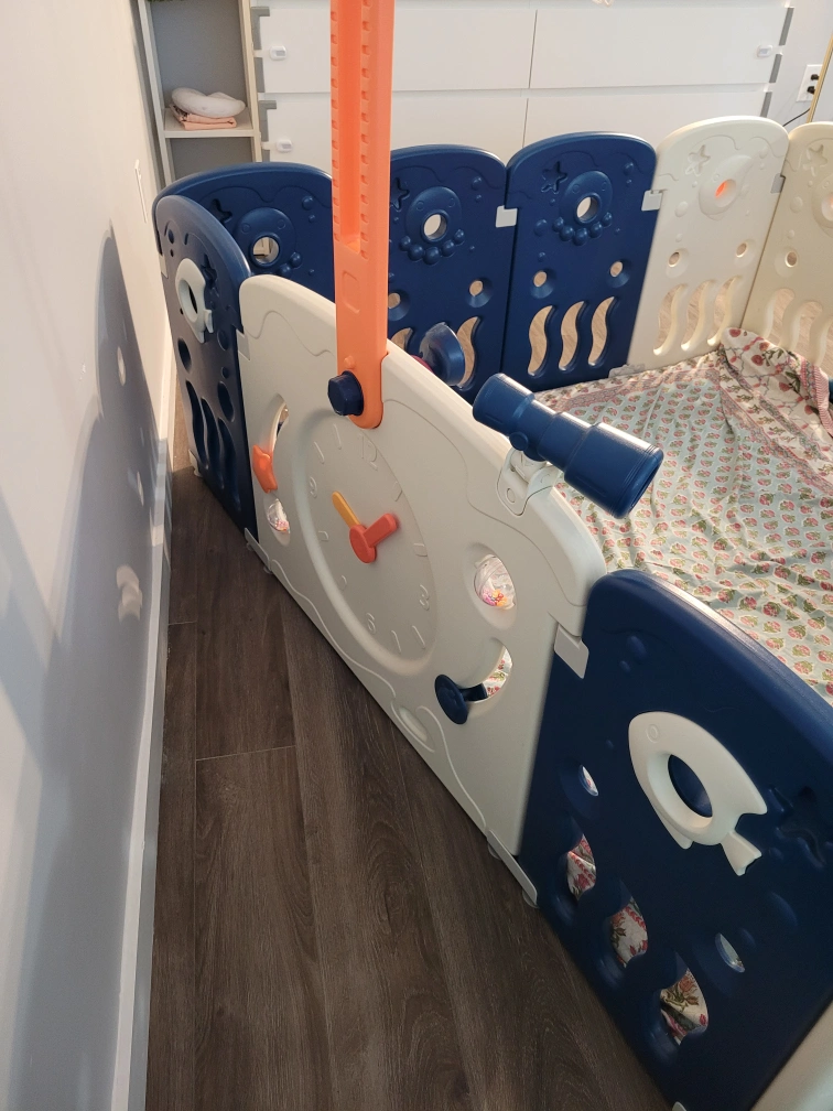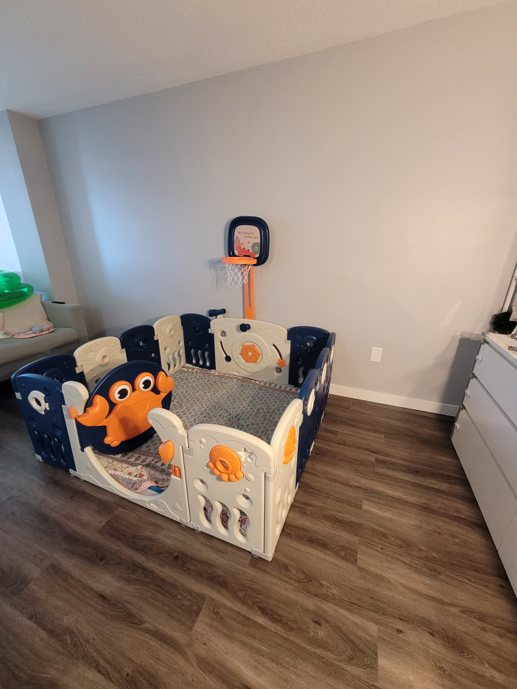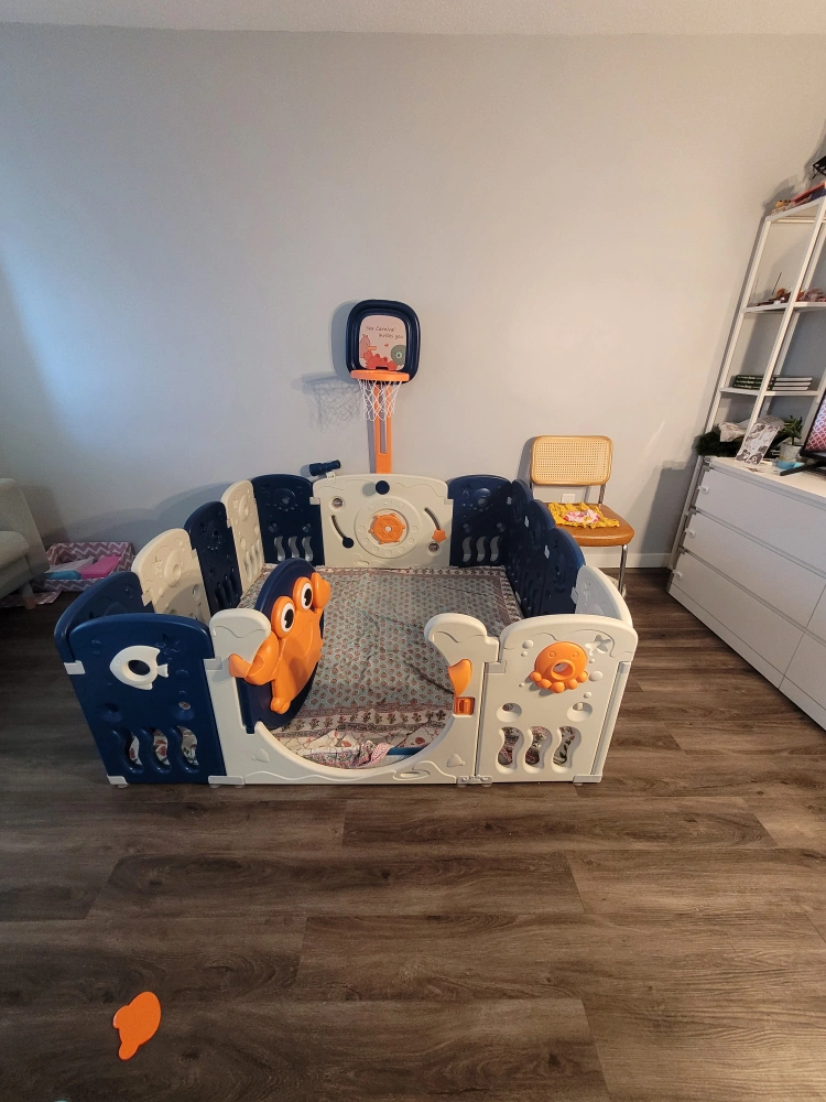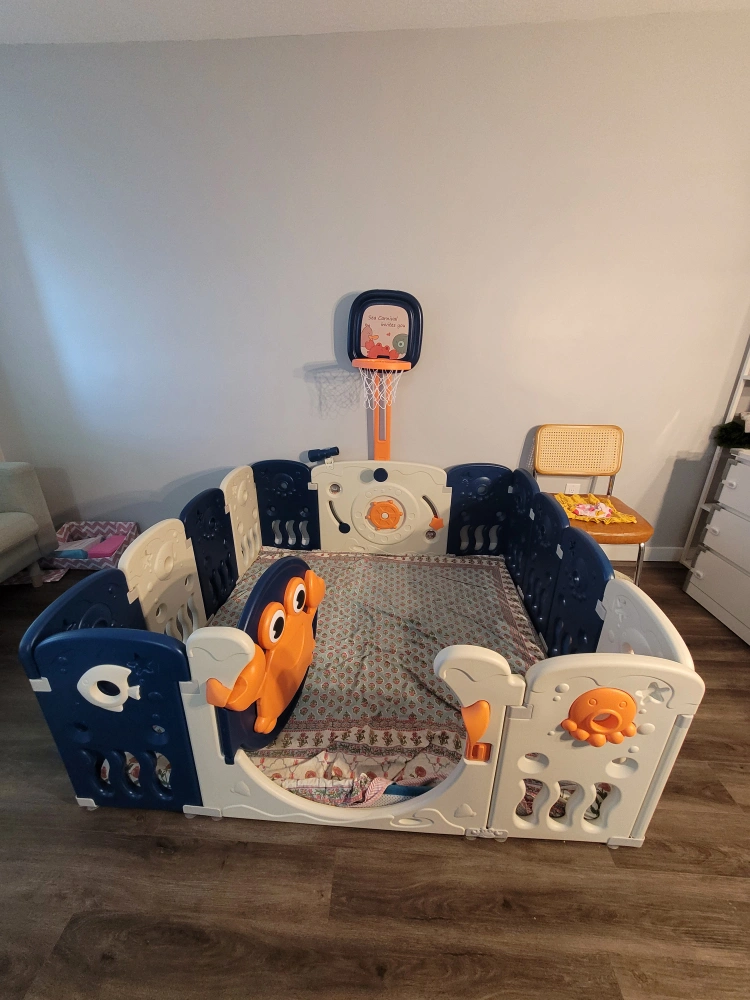 Playpen includes an attached basketball hoop, basket ball with pump, rings peg with multicolor rings, and a pretend clock too.