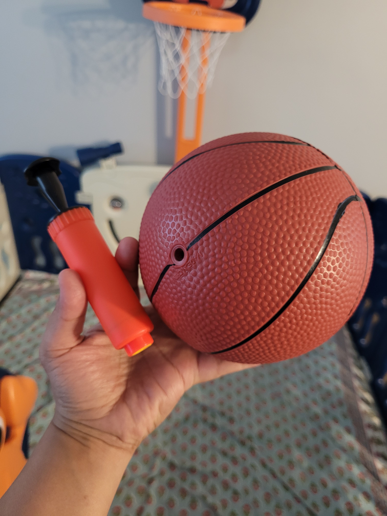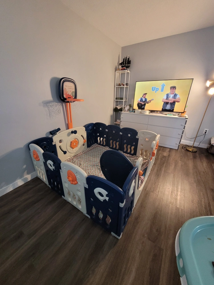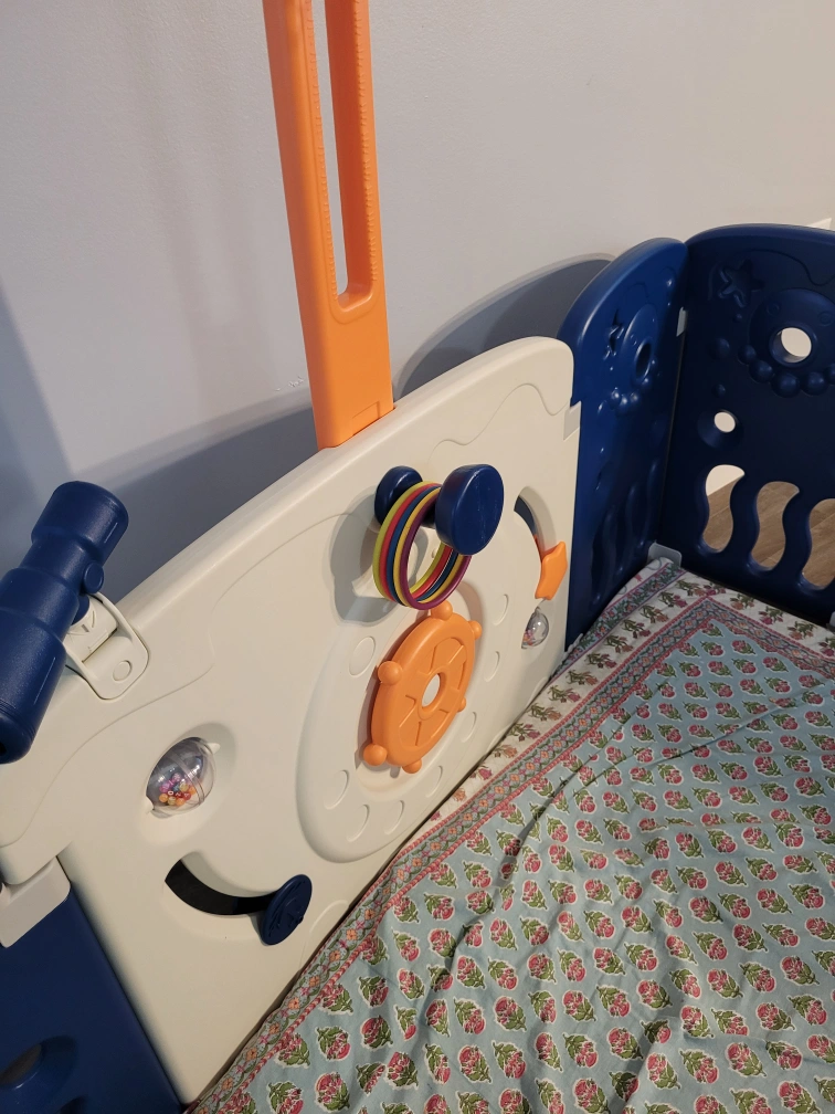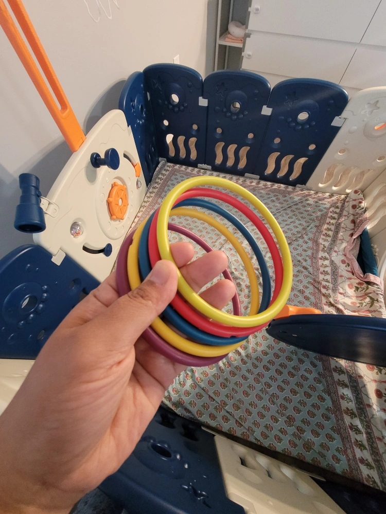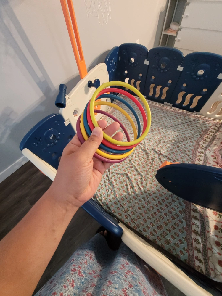 Playpen includes an attached basketball hoop, basket ball with pump, rings peg with multicolor rings, and a pretend clock too.