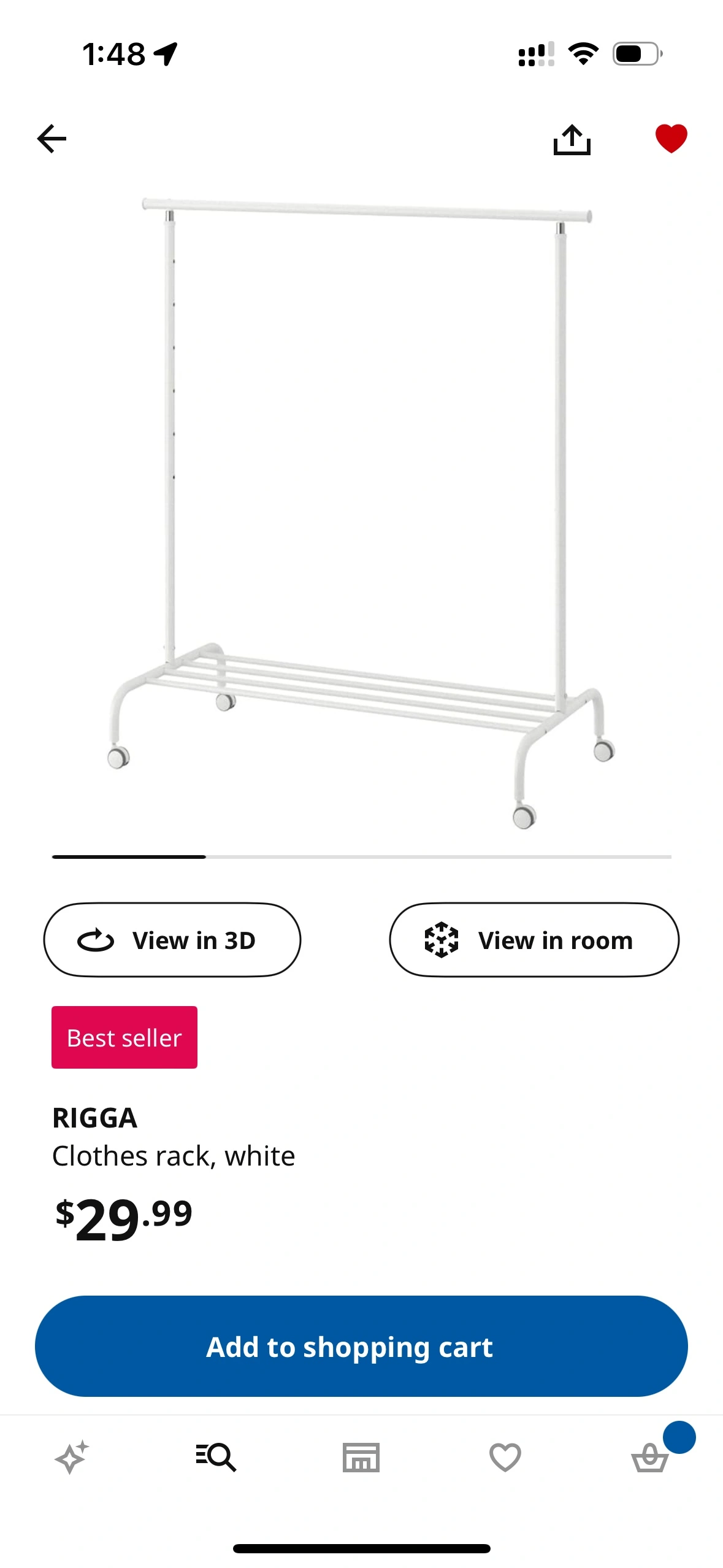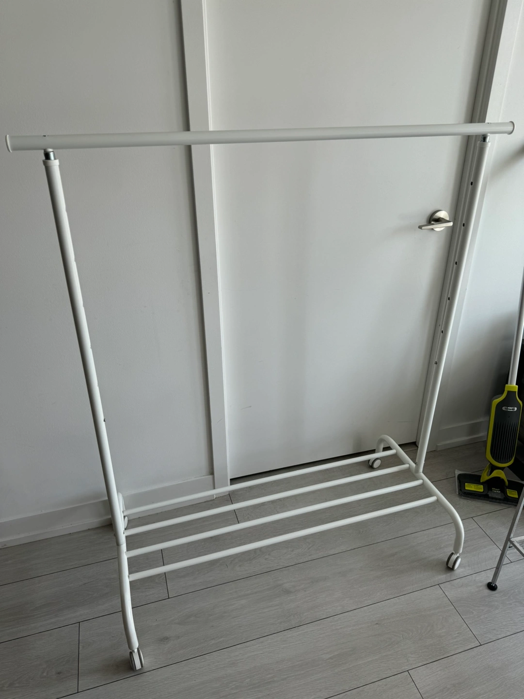 IKEA Rigga cloths rack, White clothes rack with wheels. Good for extra storage.
