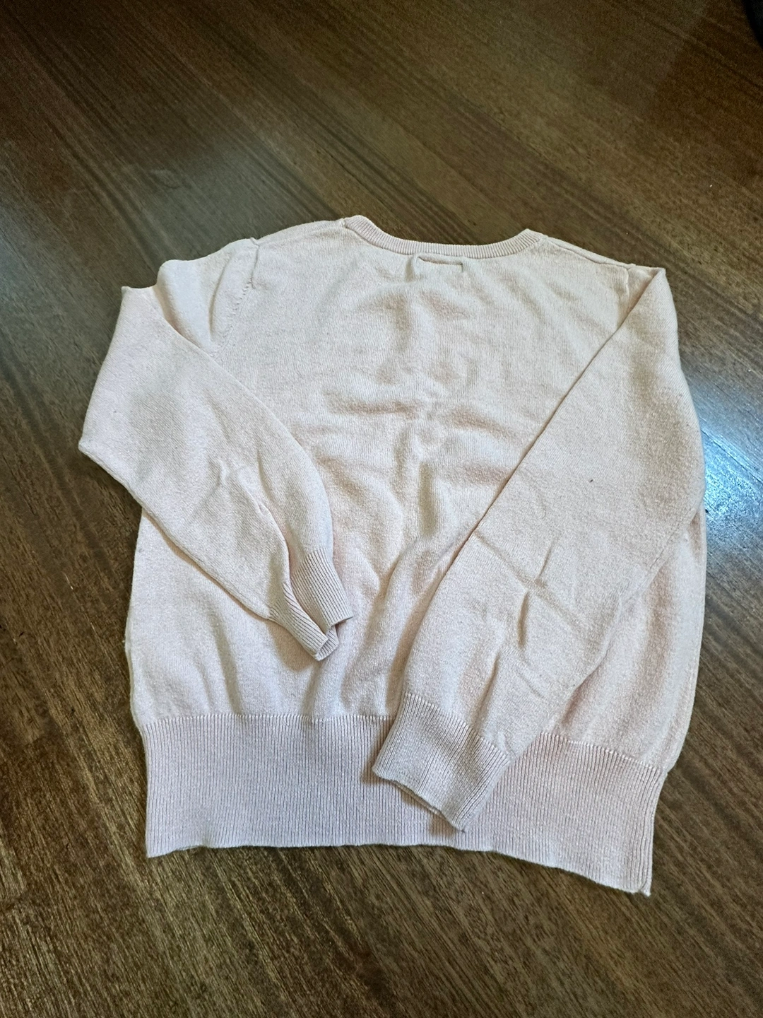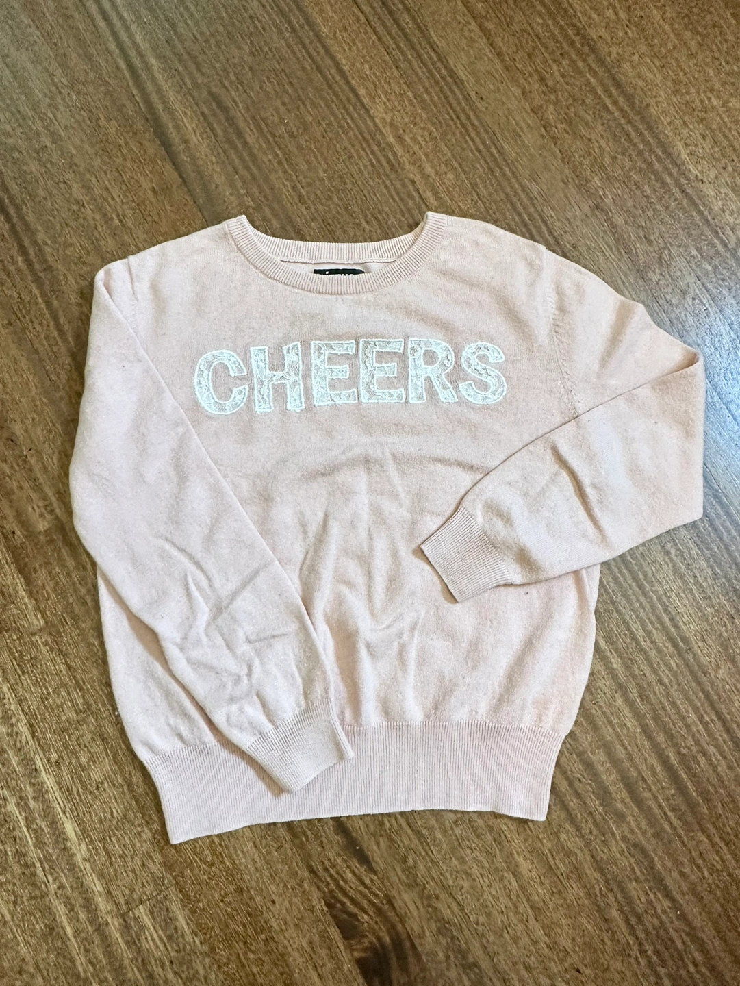 600Size Small, long sleeve, crew neck, blush pink sweater with a white "Cheers" graphic. Made by the brand "izzue".