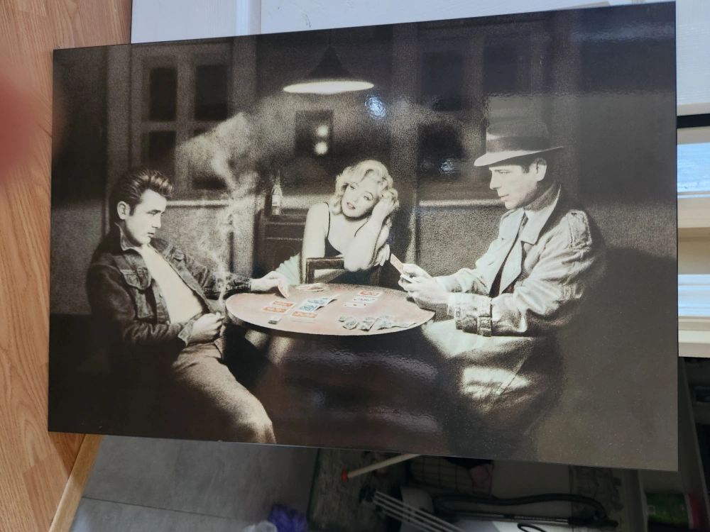 This is a large wall art piece featuring Marilyn Monroe, Elvis Presley and James Dean. It is made of a hard composite material and measures 24 inches by 36 inches. It is in really good condition