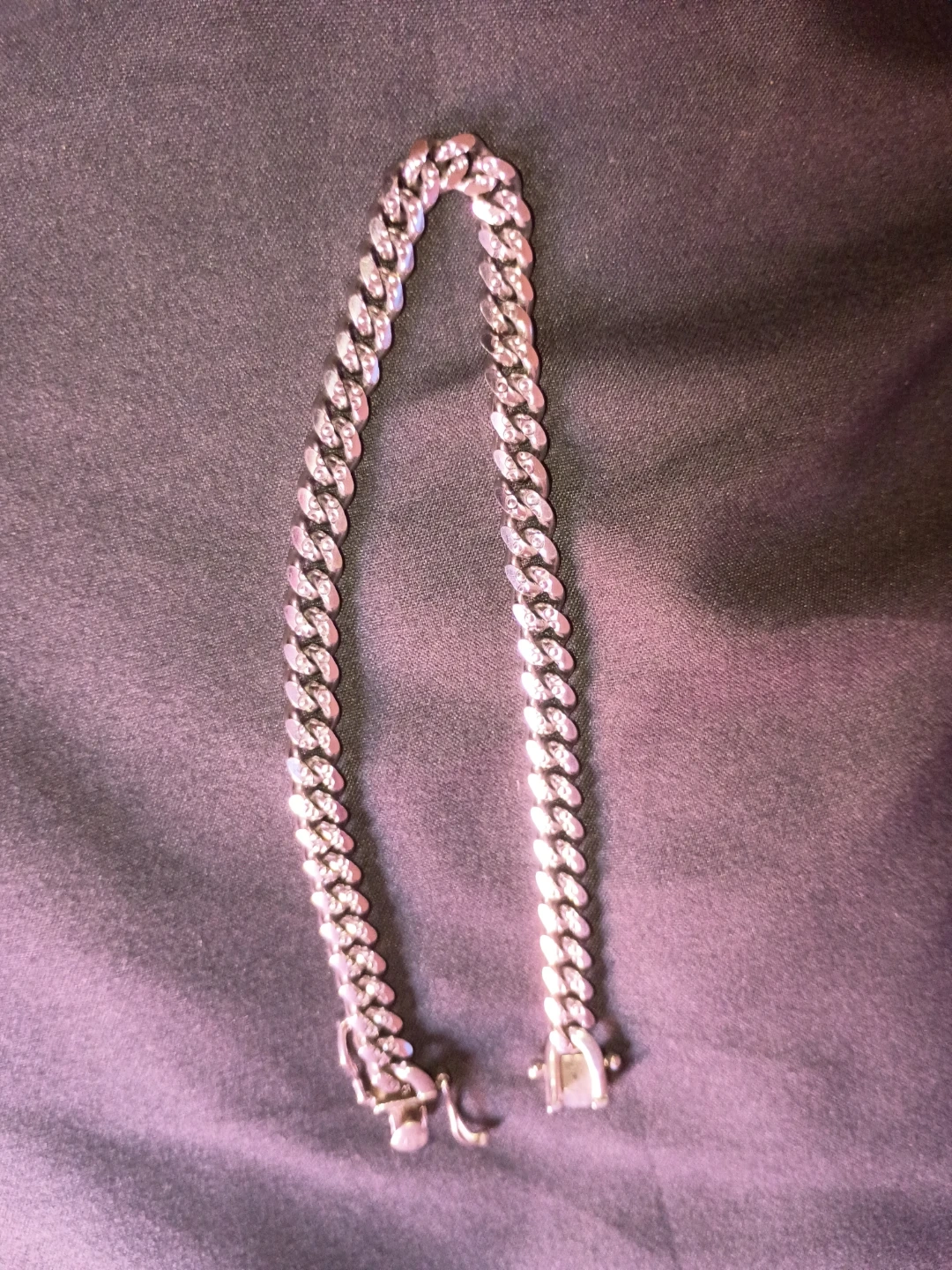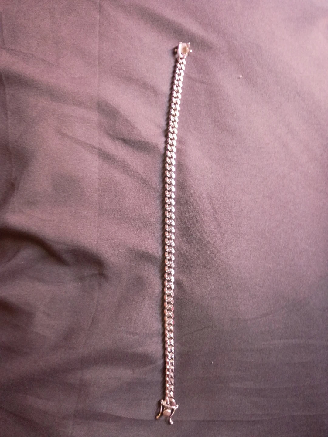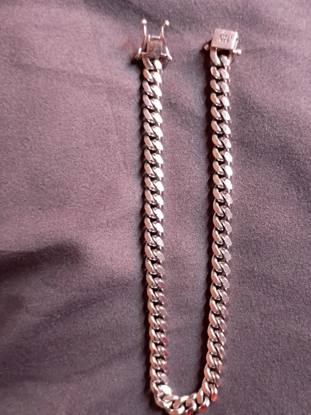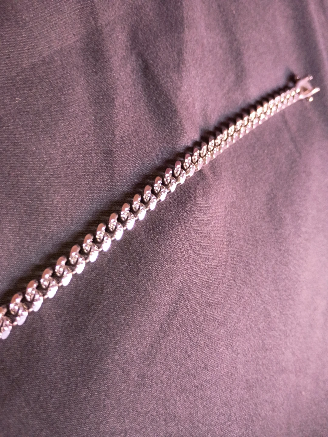 This is a silver curb chain bracelet. It has a polished finish and a secure clasp closure. The links are interlocking for a classic look. It's a versatile accessory that adds a touch of shine!