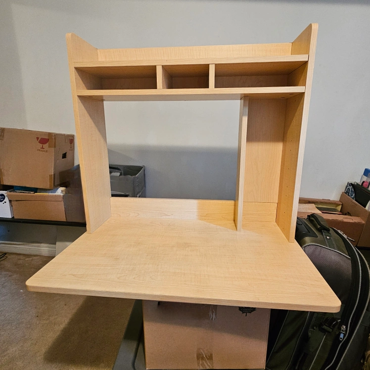 Custom made desk shelfing. Can be stationed on desk for extra work space, or wall-mounted, or added legs for stand alone work station.