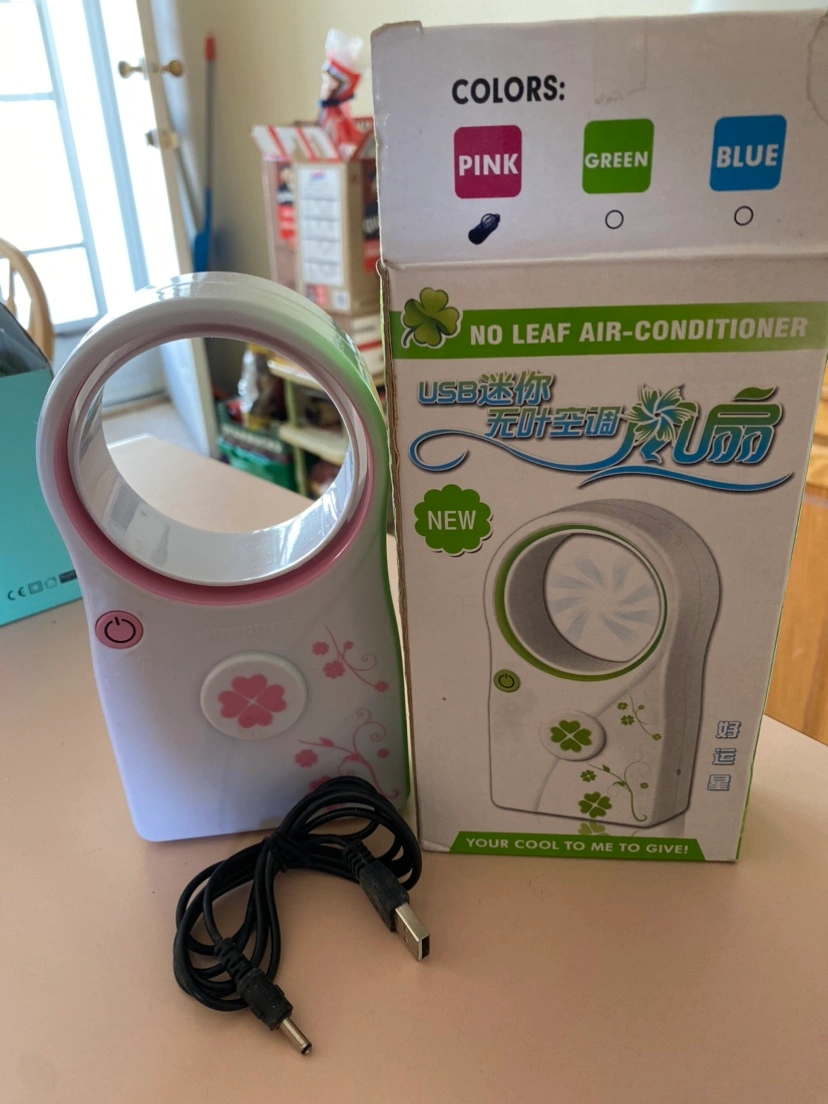 This air conditioner is powered by a USB port. It has a fan to cool the air and a water reservoir to help with evaporative cooling. It comes with a power cord for charging. The unit is white and has a small power button. It is designed to be portable and can be used in a variety of places. The unit has the instruction "Open the cover down into the frozen sponge".