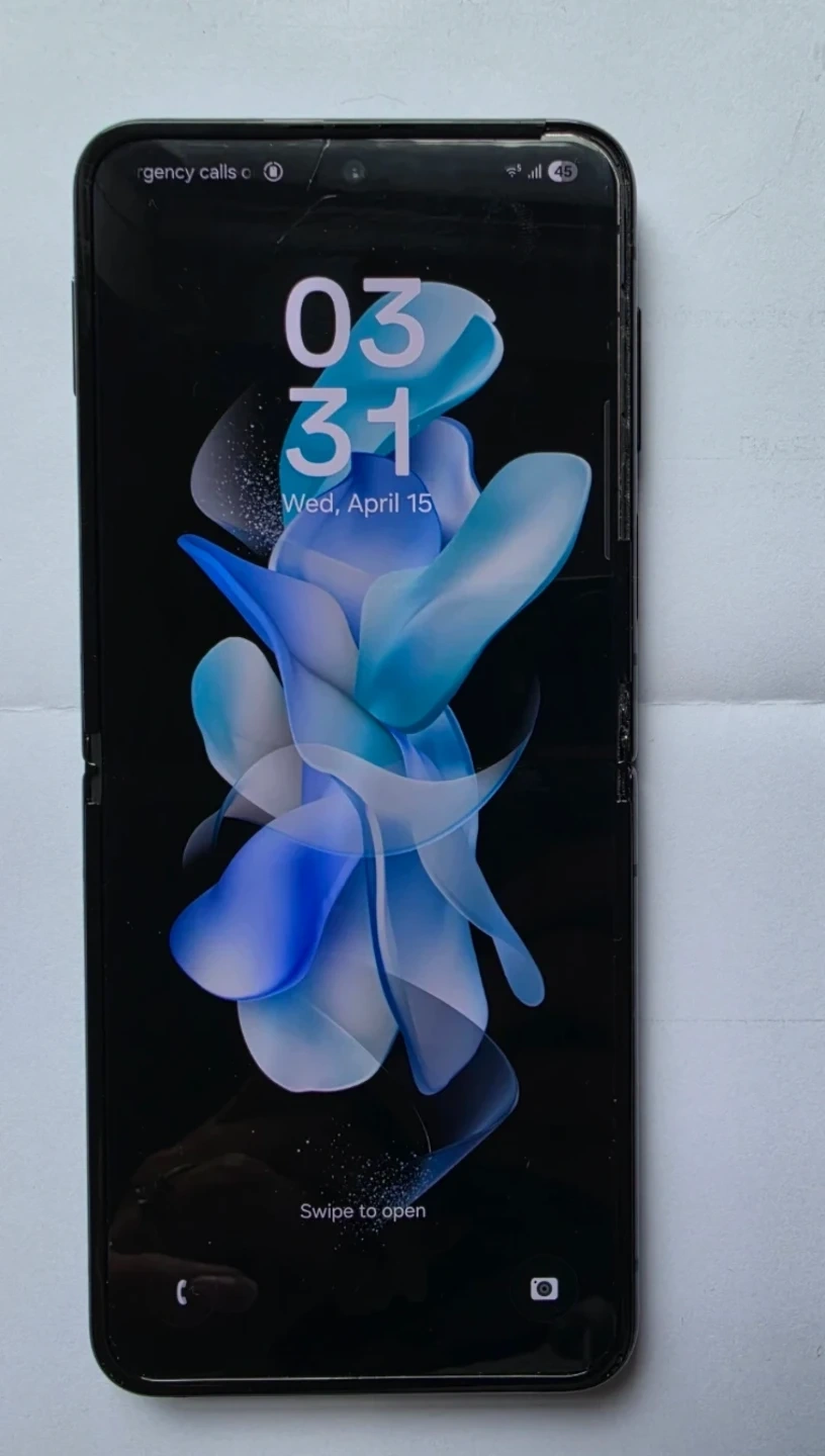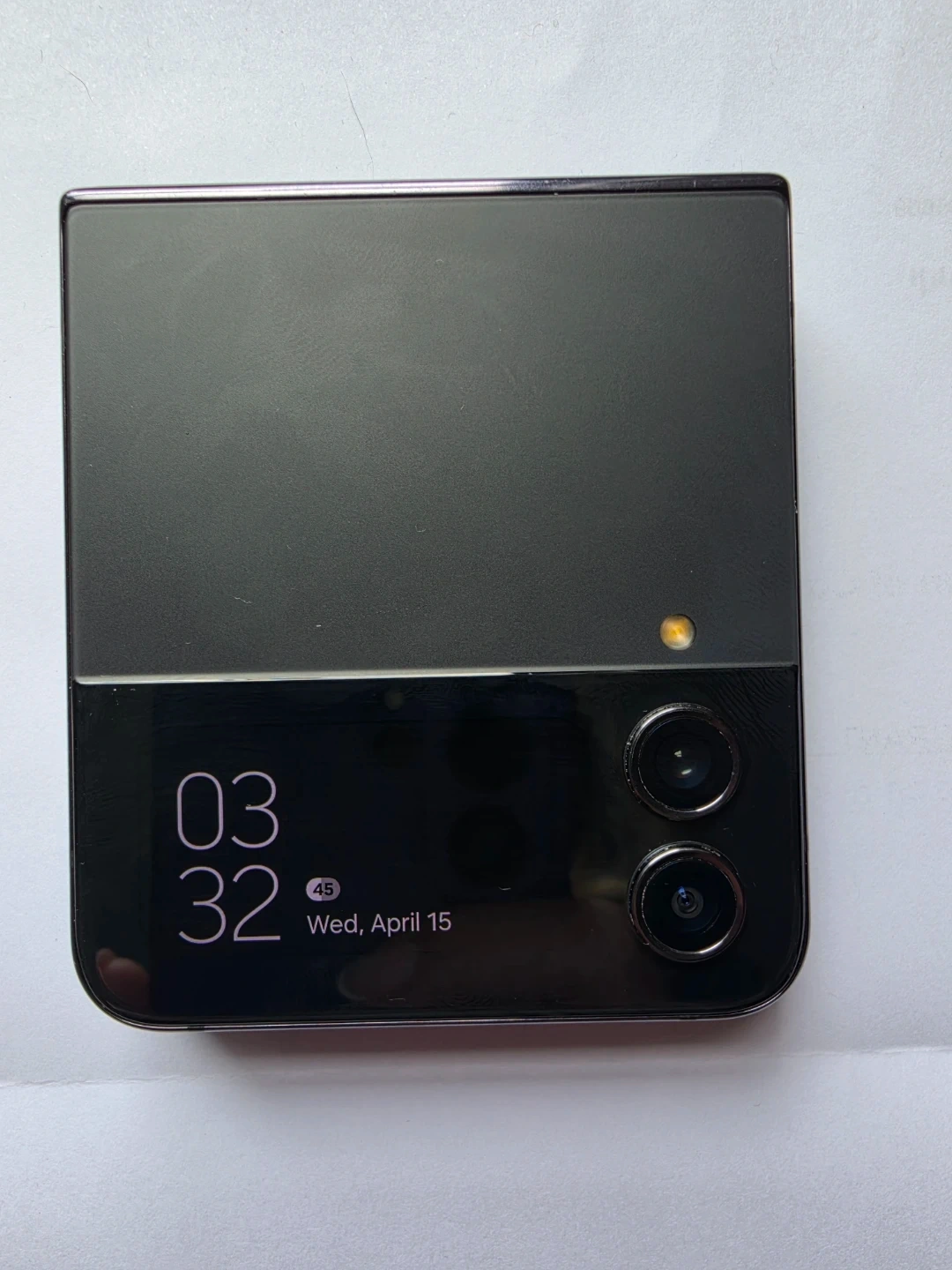 This is a Samsung Galaxy Z Flip 4 smartphone. It's a foldable device with a large display. Cosmetic condition: 7/10. There is small plastic piece missing at the edge, it does not affect functionality. No scratches on the outside.