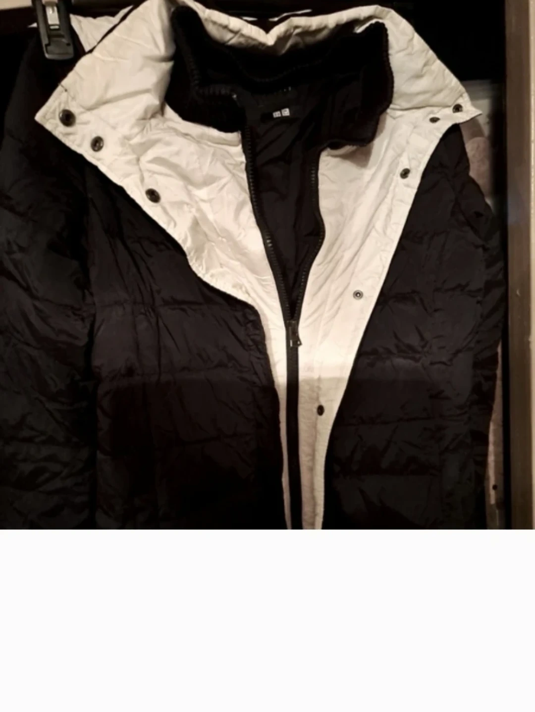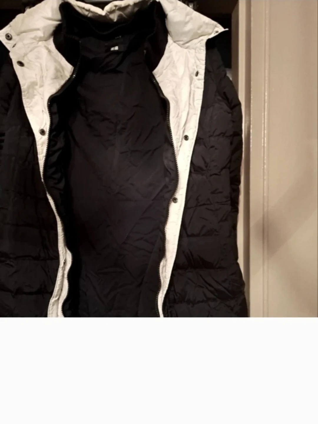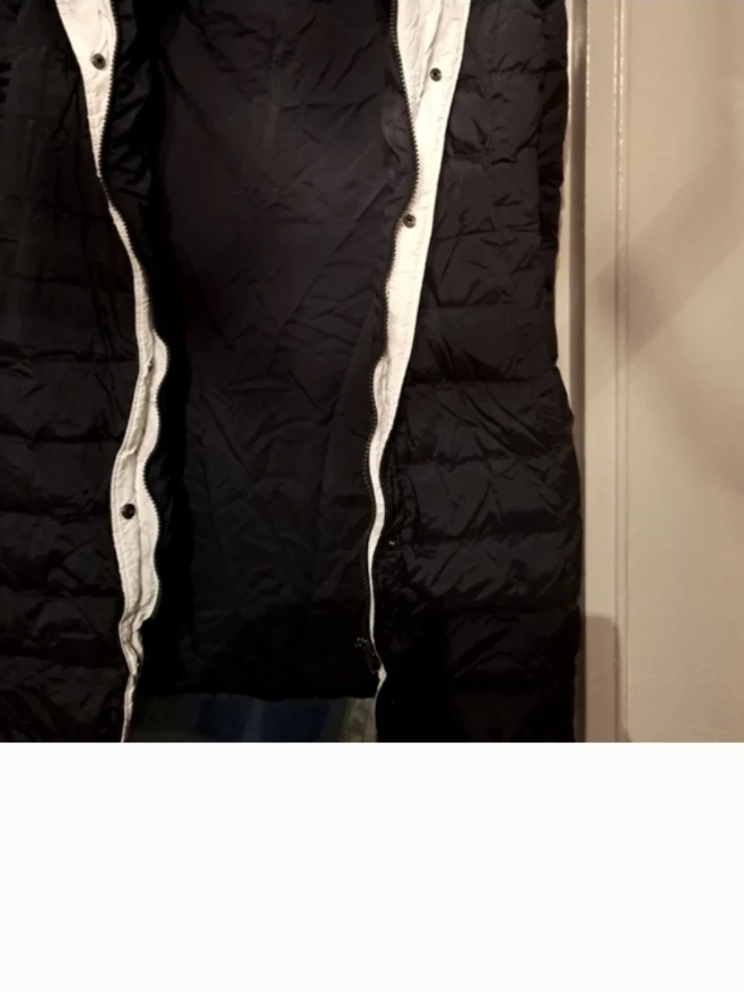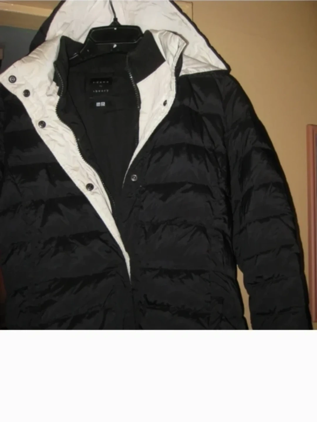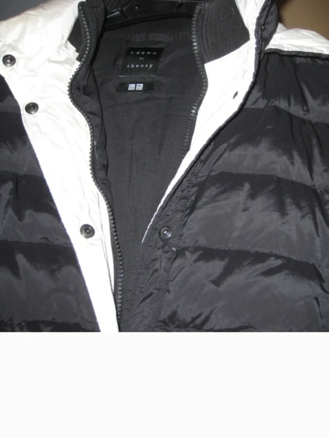 NEW, BLACK with WHITE DOWN HOODED COAT by Theory. See ALL PHOTOS. JR.'S AND KIDS (SEE LAST PHOTO). 2 lower pockets. Fits 14 inches to 15.75 in. pit to armpit.
