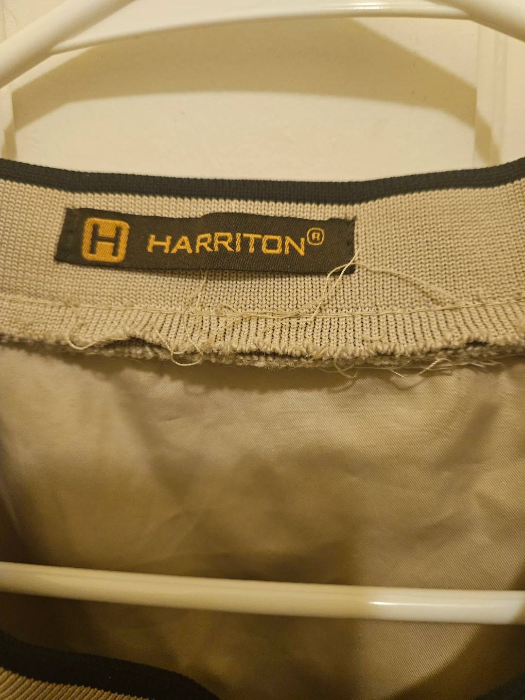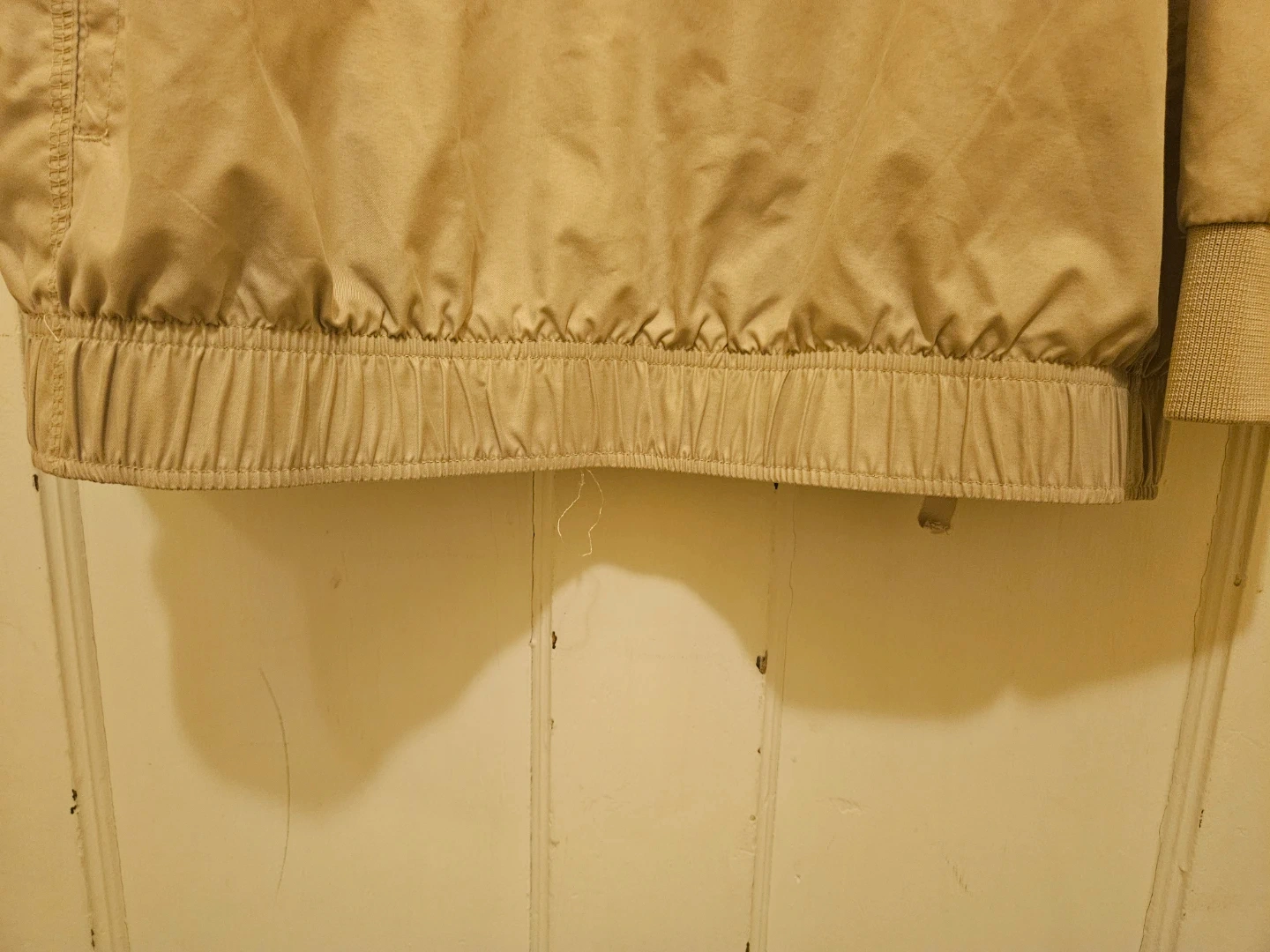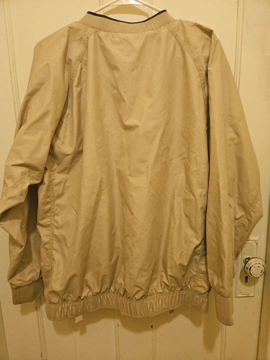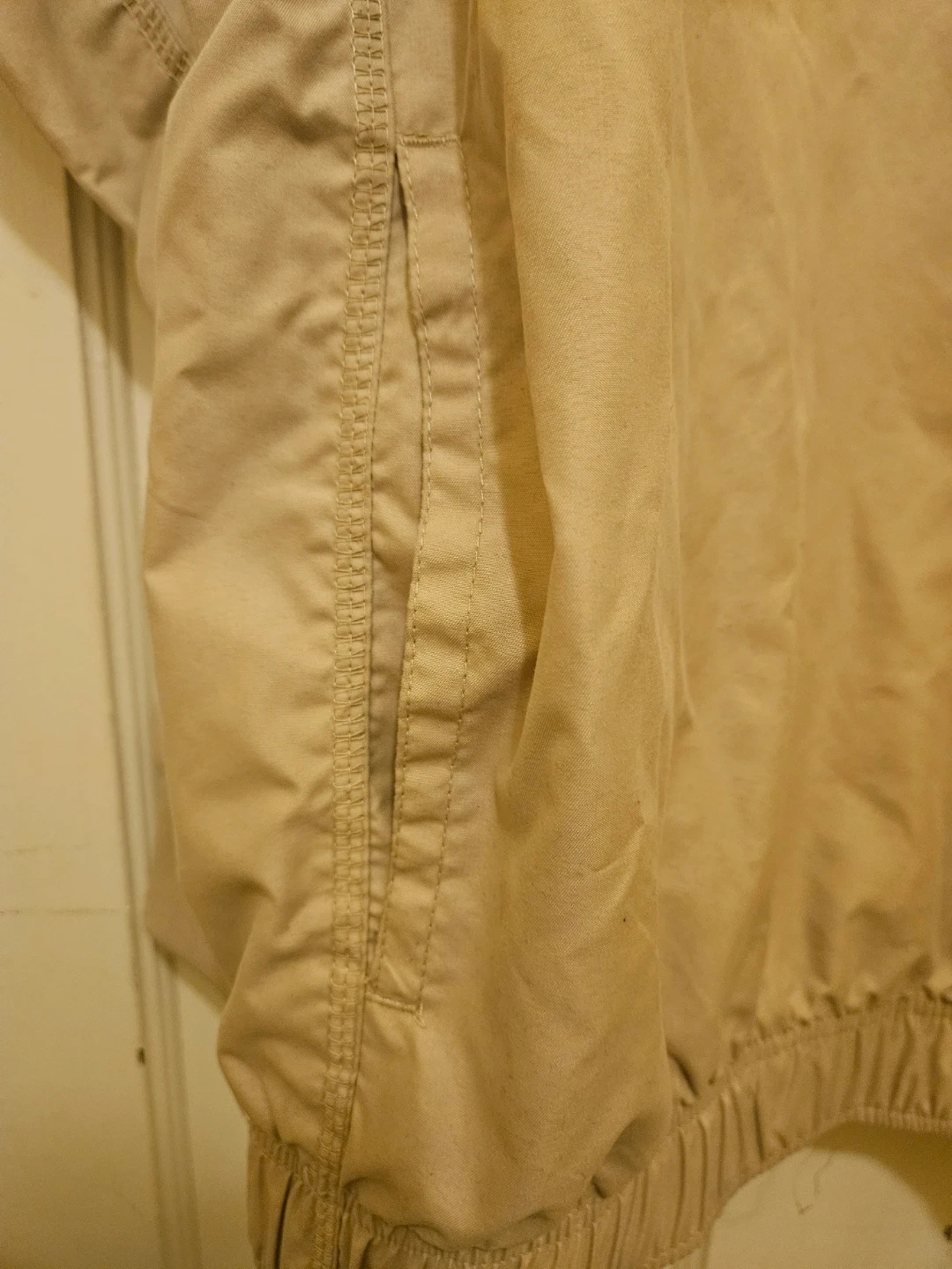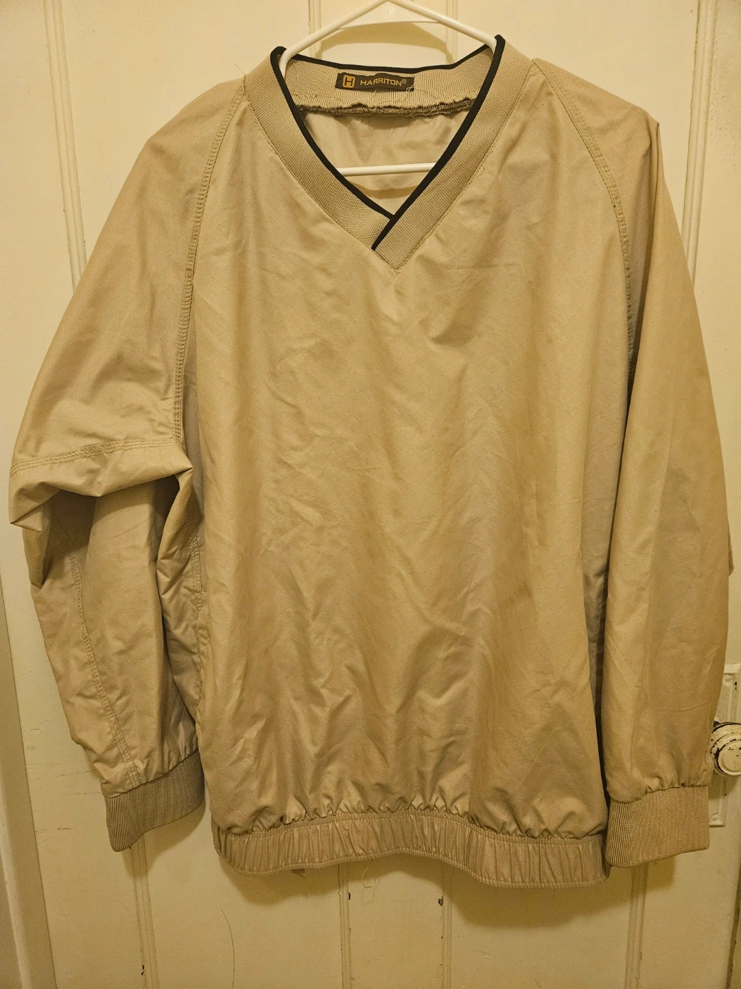 This is a tan pullover windbreaker by Harriton. It features a v-neck with a black trim. There are two front pockets.