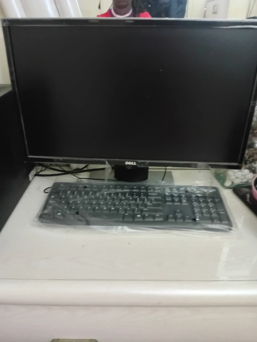 Dell monitor and a wired keyboard. Keyboard is still in its plastic wrapping. This setup's ready for your desk!