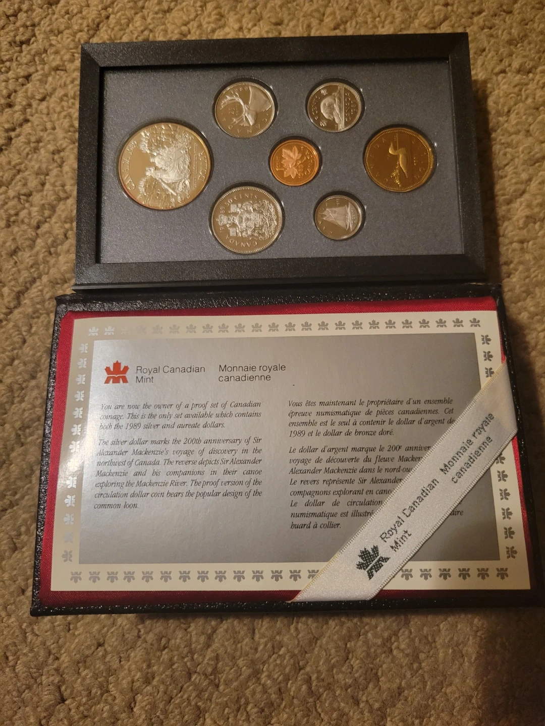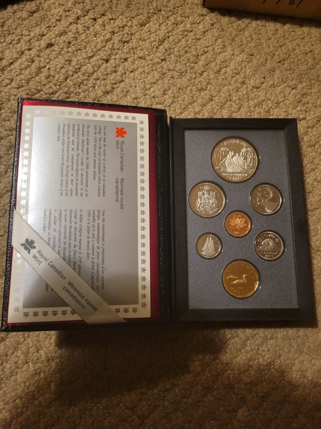 The coin set shown is a 1989 Canada 7-Coin Double Dollar Proof Set, issued by the Royal Canadian Mint. The set commemorates the 200th anniversary of explorer Alexander Mackenzie's voyage to the Arctic Ocean in 1789.