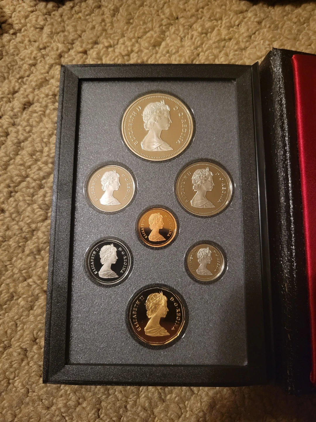Packaging: The coins are sealed in a transparent plastic film and presented in a black leather-like booklet-style case with a red satin interior, as seen in your image.
