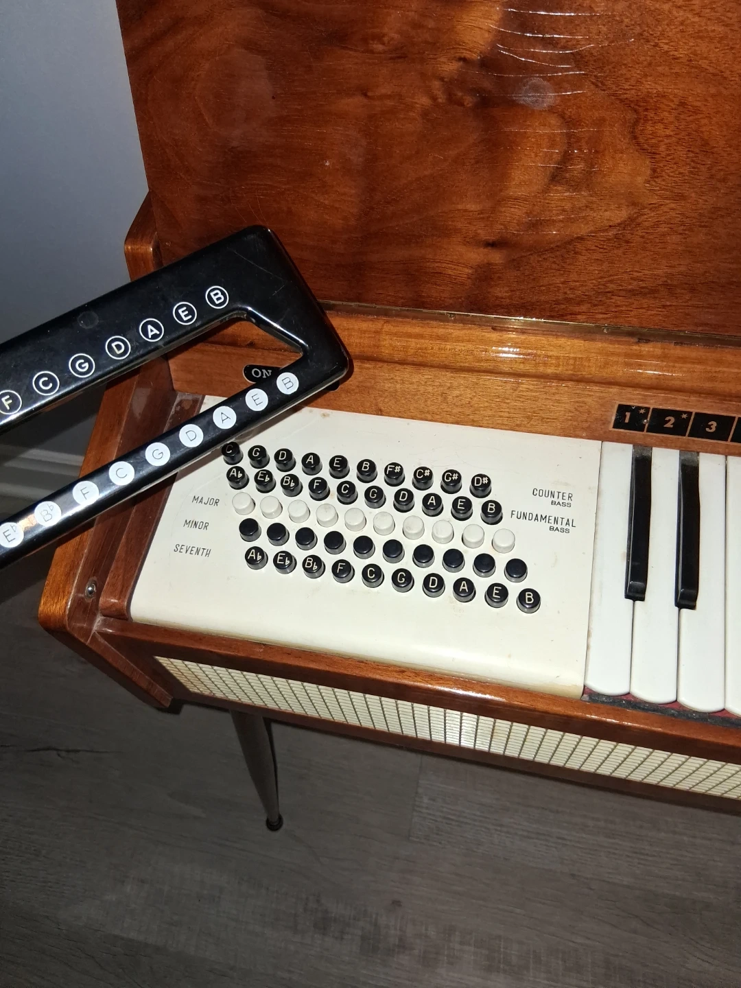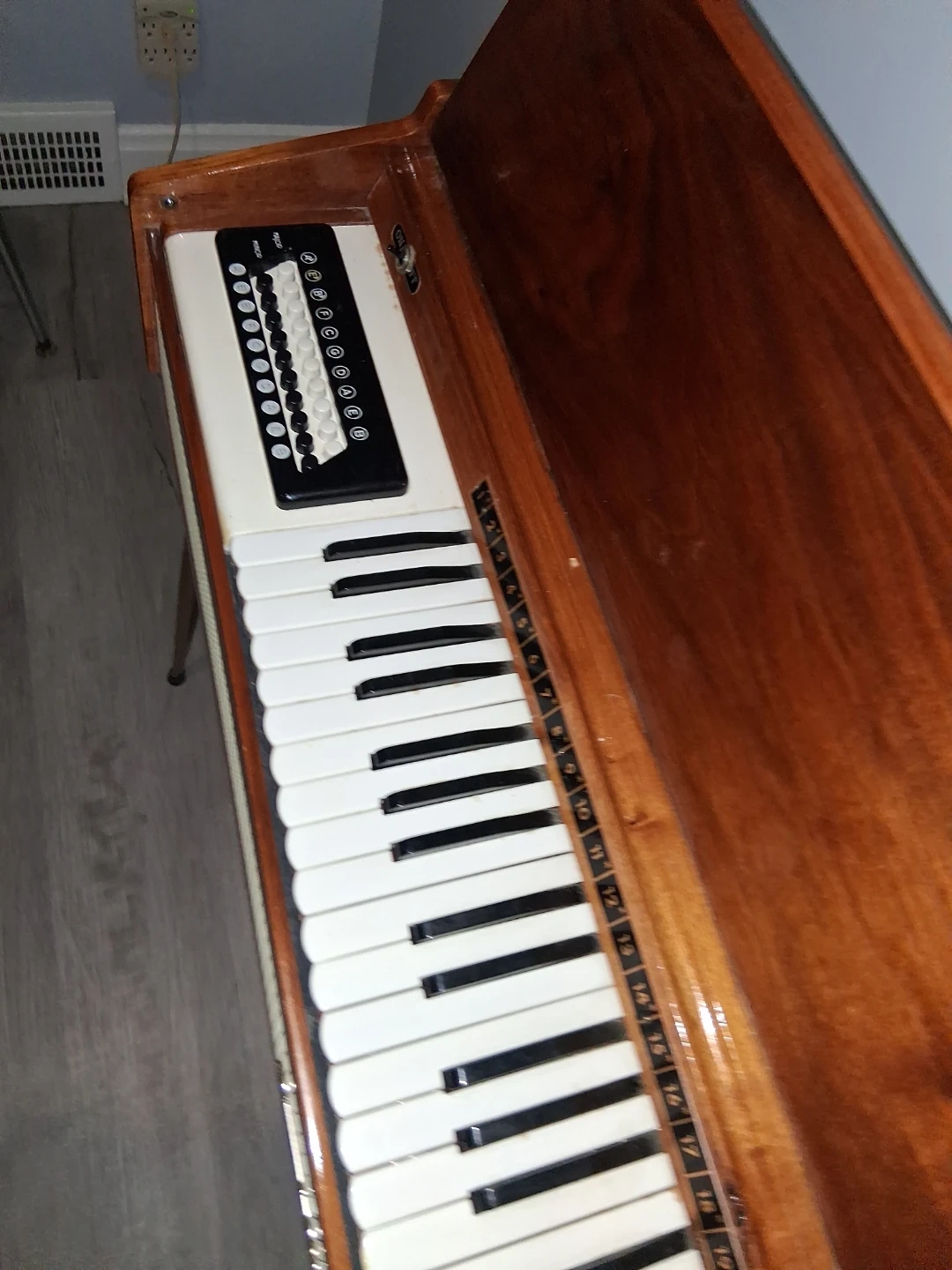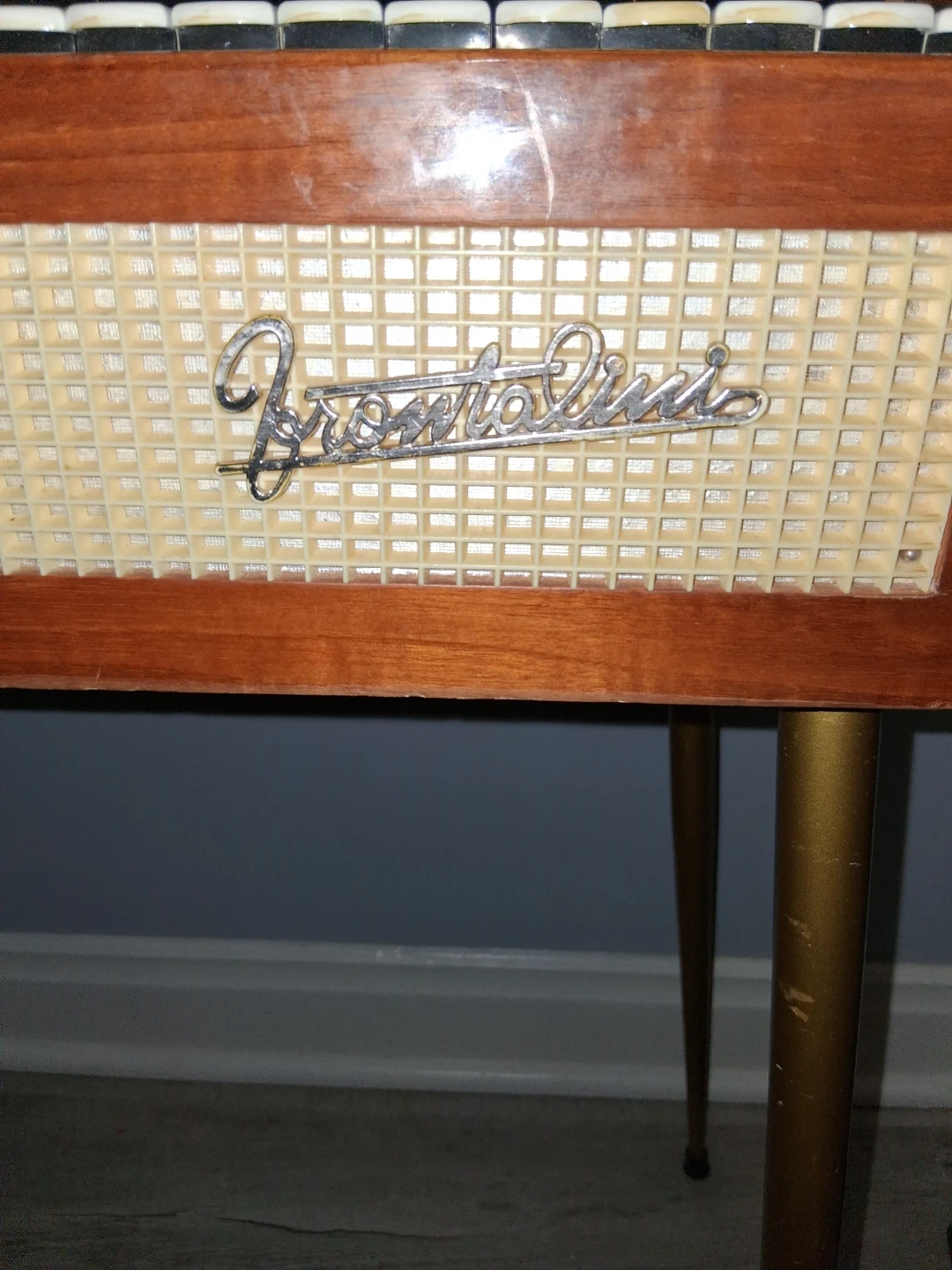 This vintage frontalini model electric keyboard features a wooden casing and metal legs. It has 20 keys and a control panel with buttons for chords. It's a unique piece for musicians or collectors! This reeded instrument plays like a horizontal accordian.