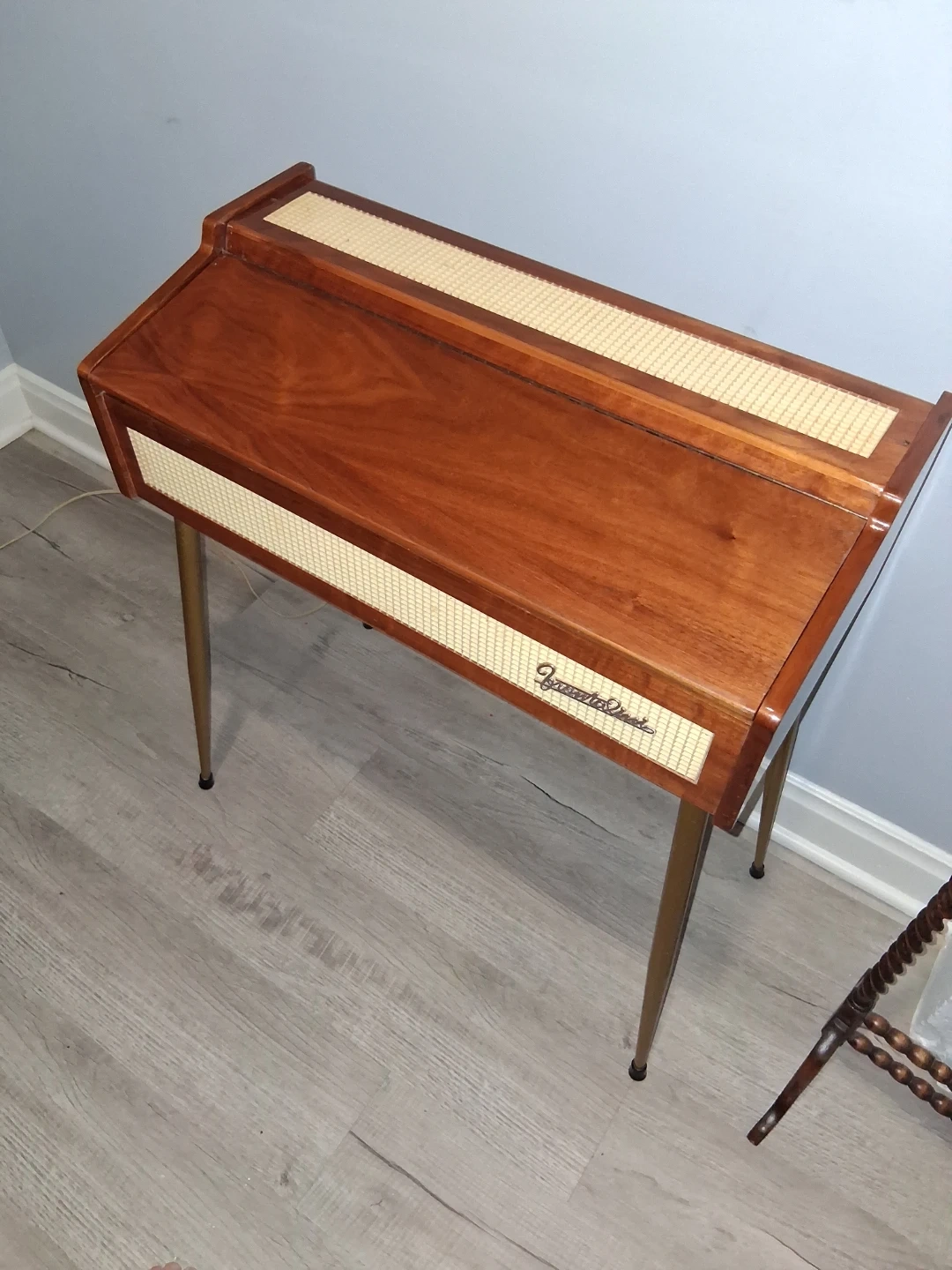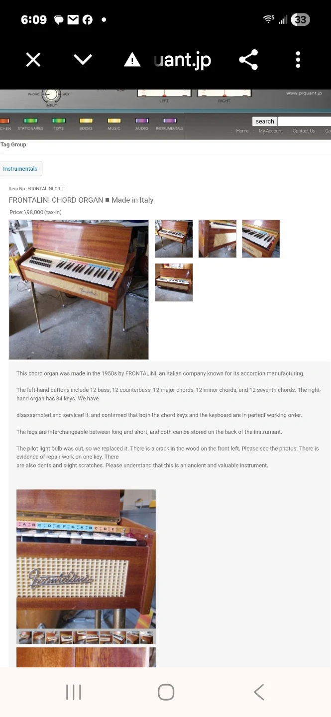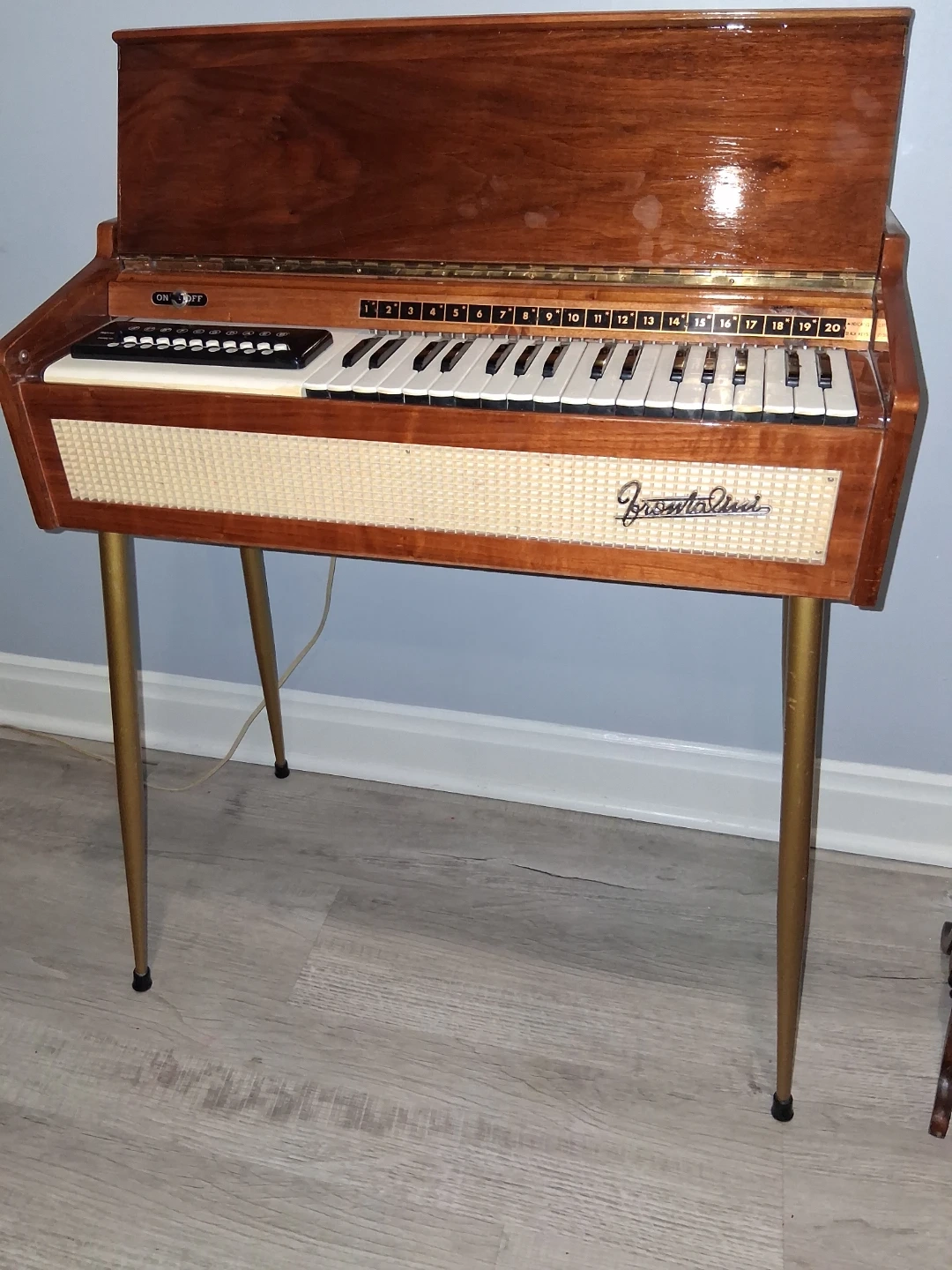 This vintage frontalini model electric keyboard features a wooden casing and metal legs. It has 20 keys and a control panel with buttons for chords. It's a unique piece for musicians or collectors! This reeded instrument plays like a horizontal accordian.