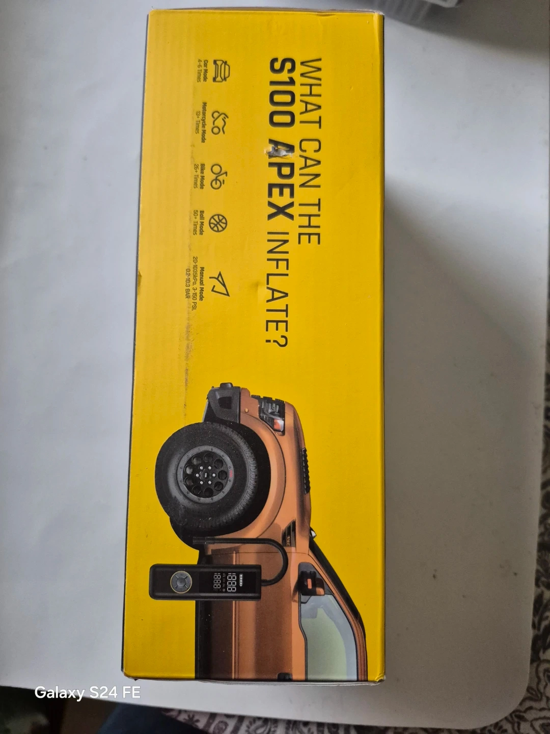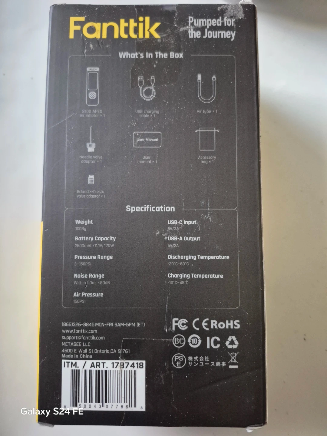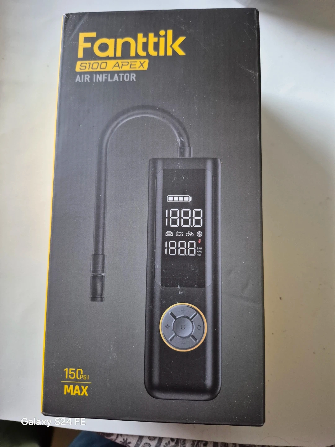 This is the Fanttik S100 APEX air inflator. It has a max pressure of 150 PSI. Includes USB charging cable, air tube, needle valve adaptor, and ball valve adaptor.