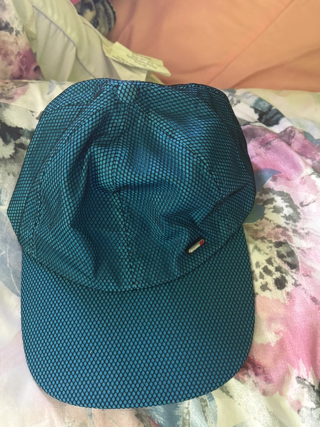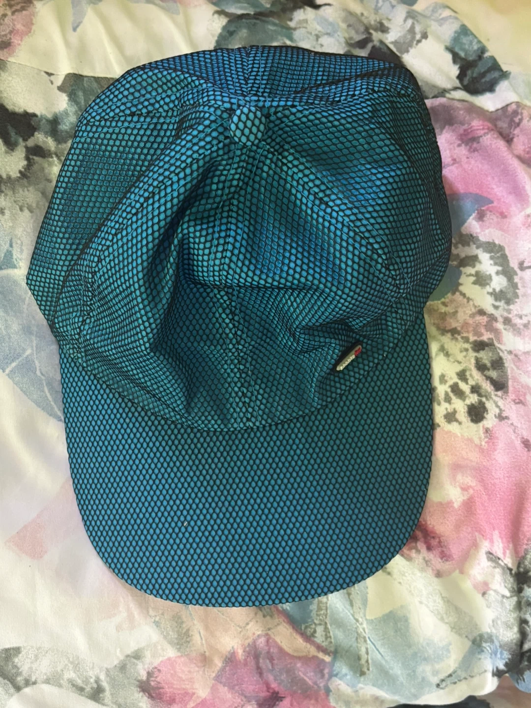 Teal baseball cap with a mesh overlay texture. Features a small red and white accent logo on the side. Adjustable strap for a comfortable fit.