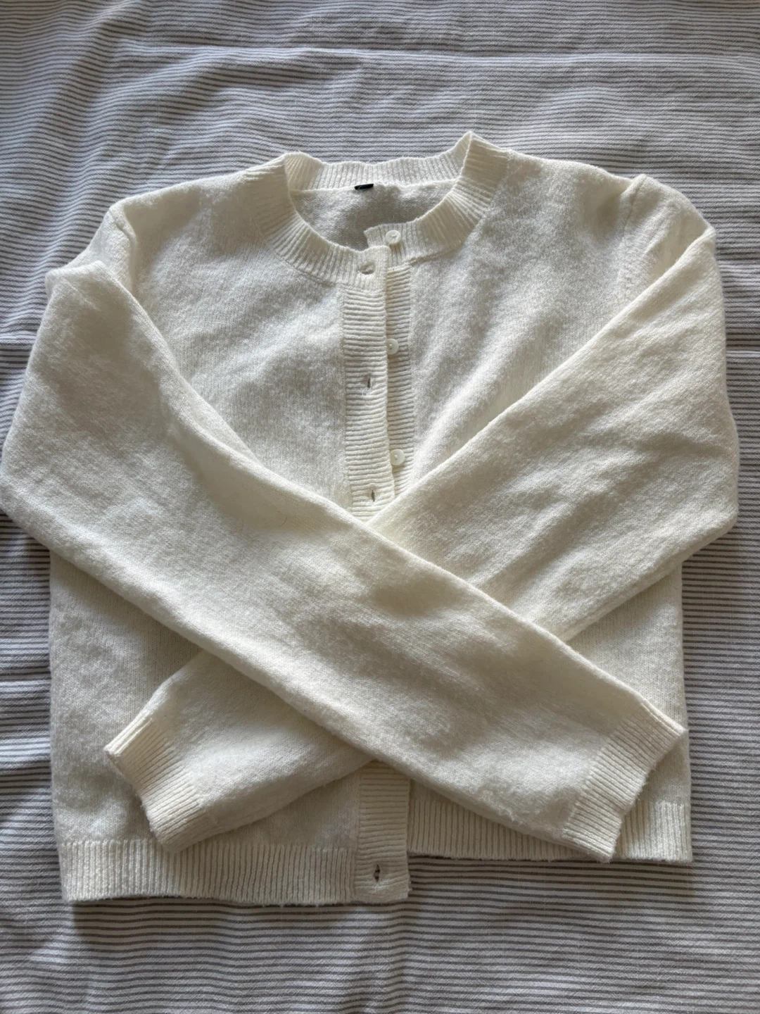 Here's a lovely white cardigan! It's in great condition and ready to keep you cozy. It's a versatile piece that can be dressed up or down, perfect for layering on those chilly days